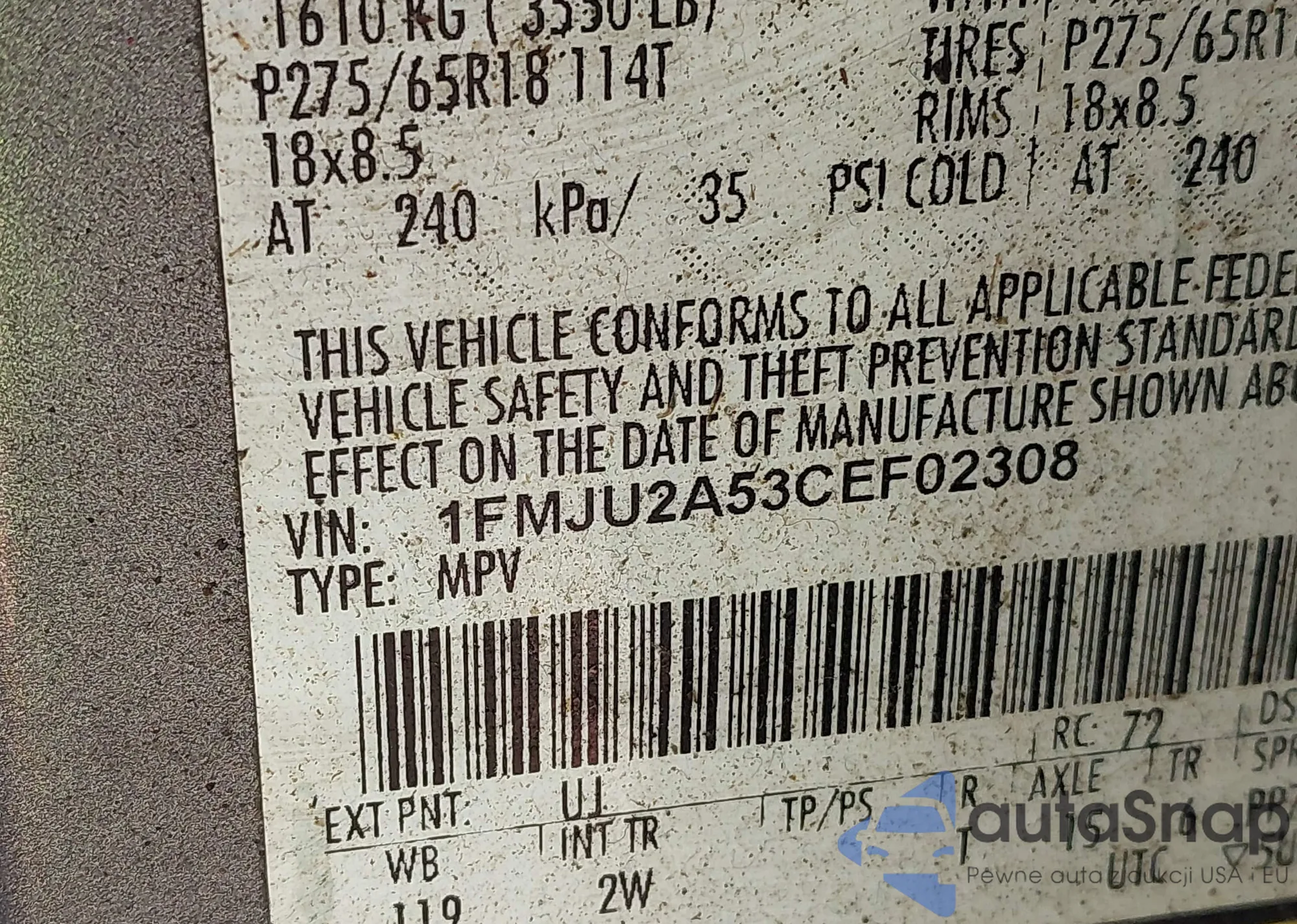 LOT: 43321477 VIN: 1FMJU2A53CEF02308
