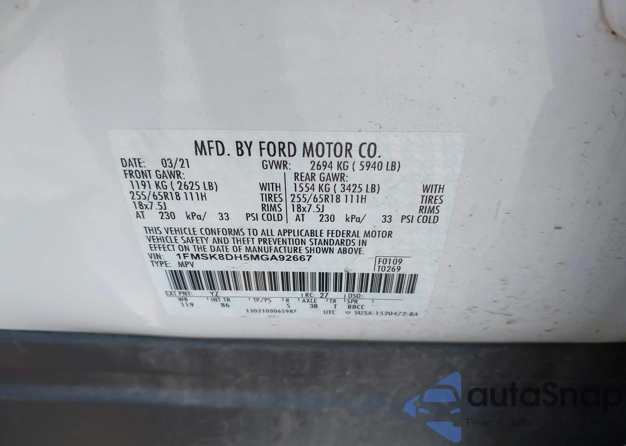 LOT: 43050109 VIN: 1FA6P8TH5M5152151