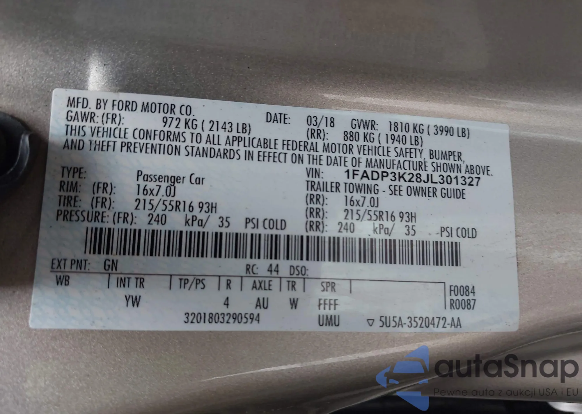 LOT: 43014366 VIN: 1FADP3K28JL301327