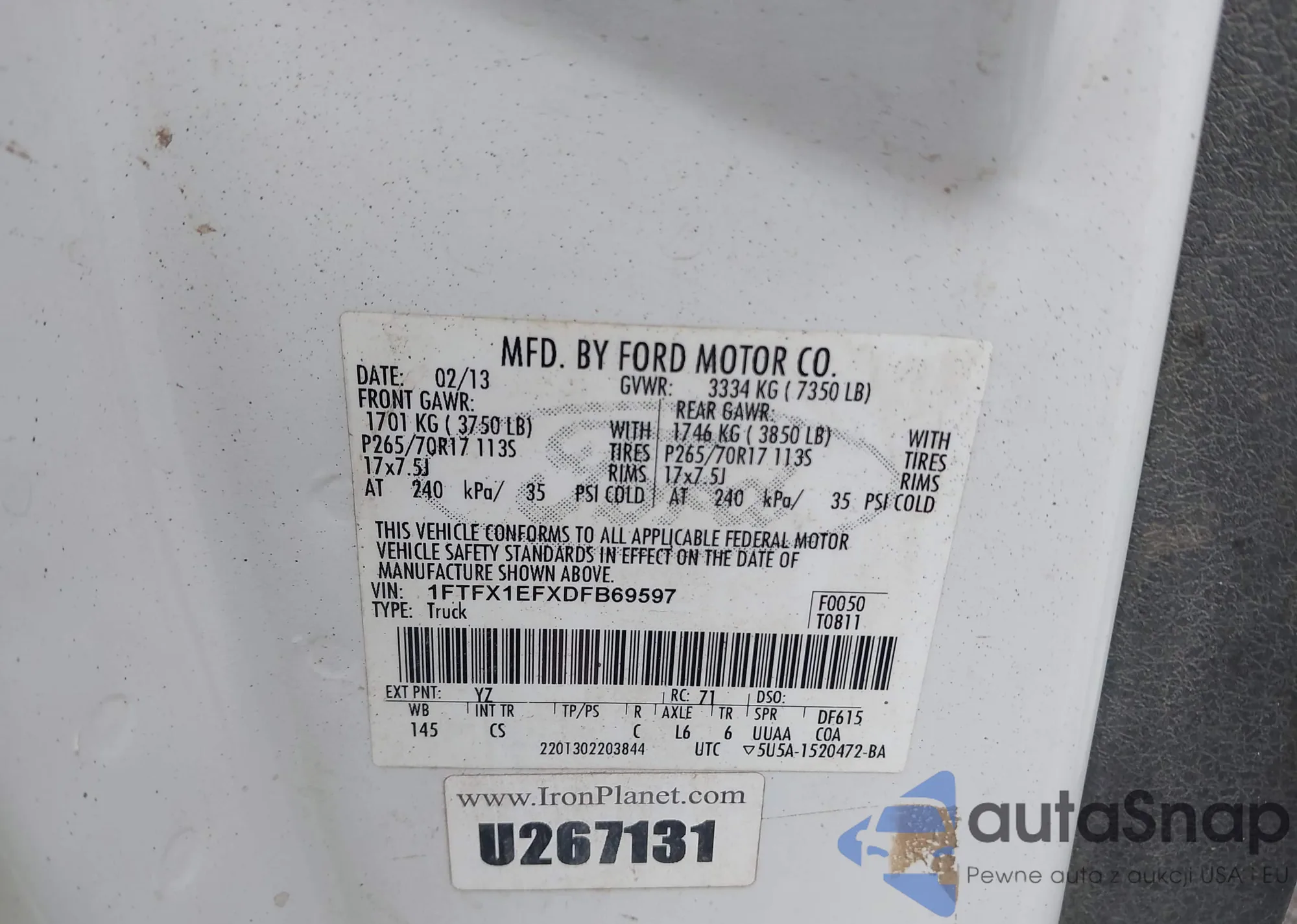 LOT: 43108670 VIN: 1FTFX1EFXDFB69597