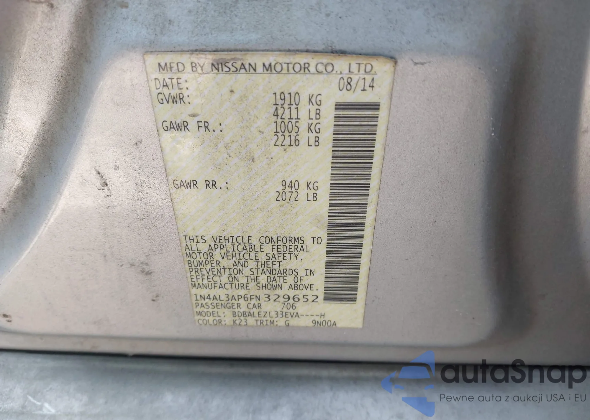 LOT: 43320508 VIN: 1N4AL3AP6FN329652