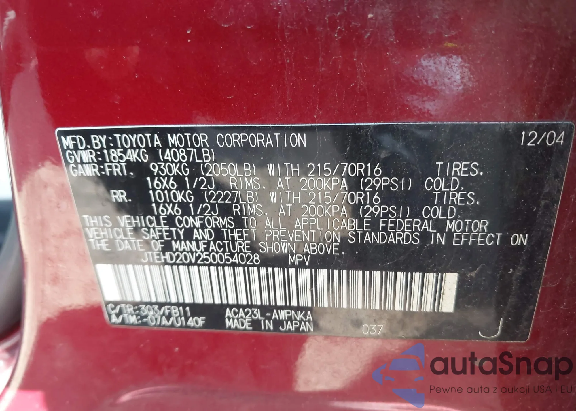 LOT: 43380747 VIN: JTEHD20V250054028