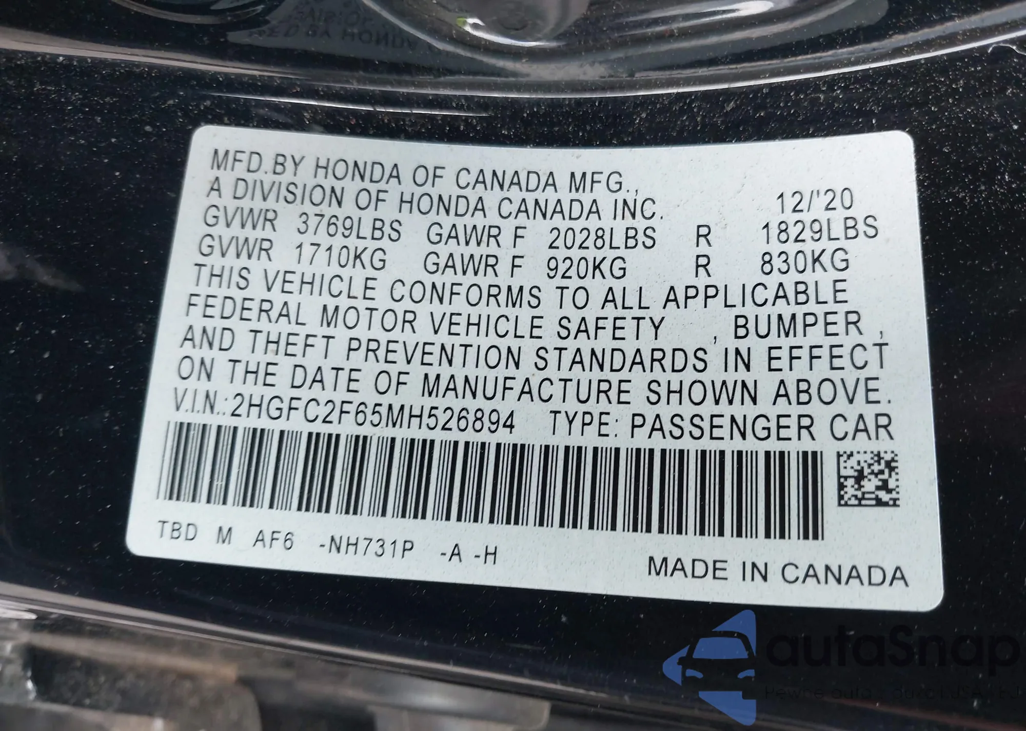 LOT: 42611069 VIN: 2HGFC2F65MH526894