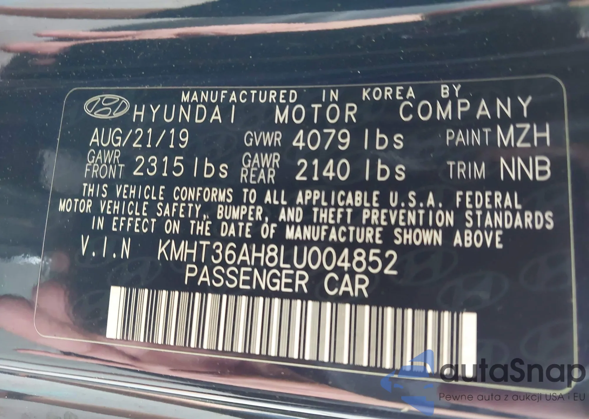LOT: 43167947 VIN: KMHT36AH8LU004852