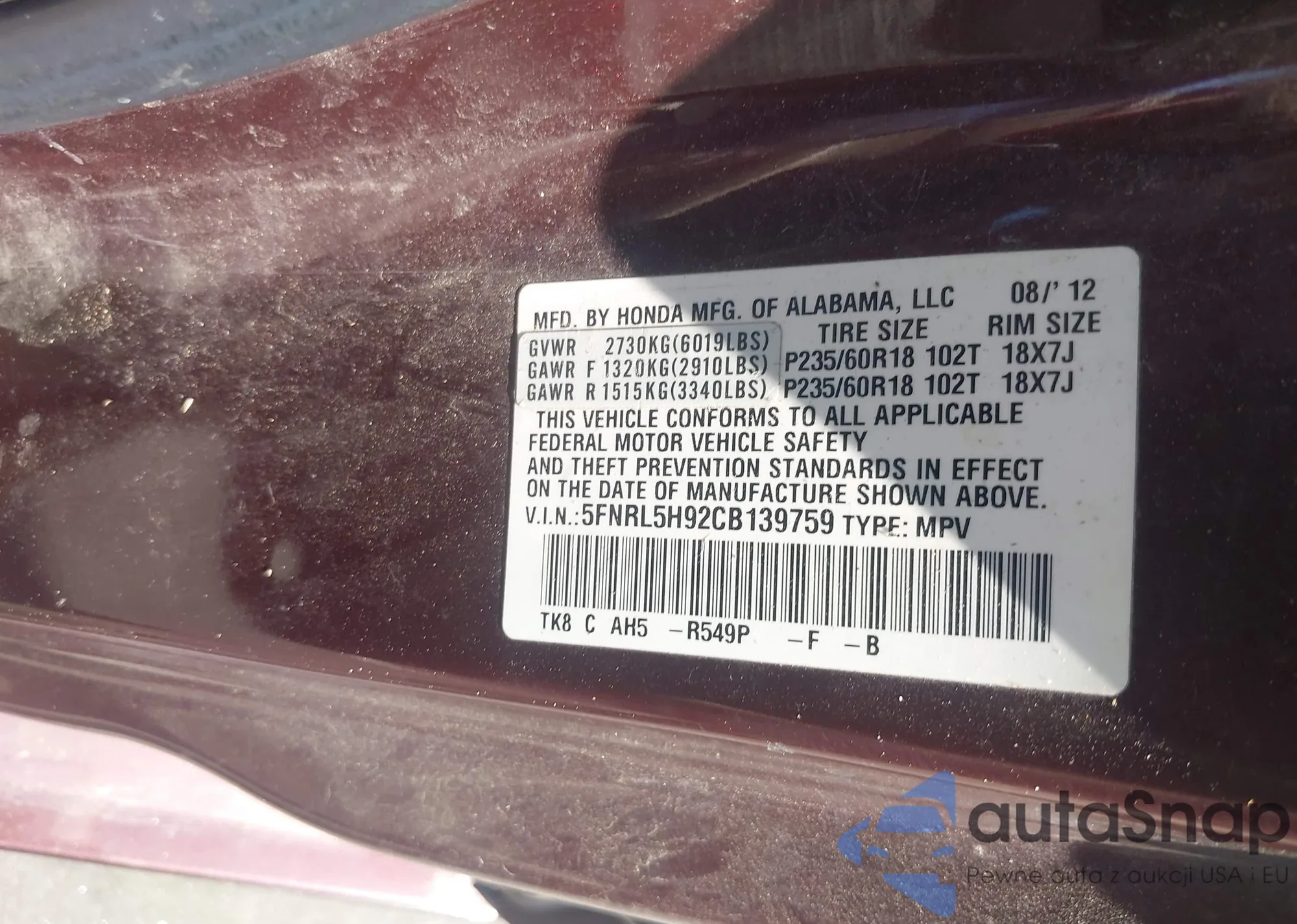 • VIN 5FNRL5H92CB139759
