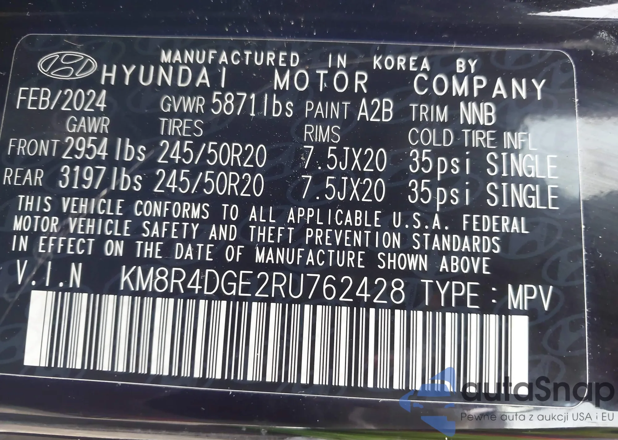 LOT: 43242440 VIN: KM8NU13CX8U038762