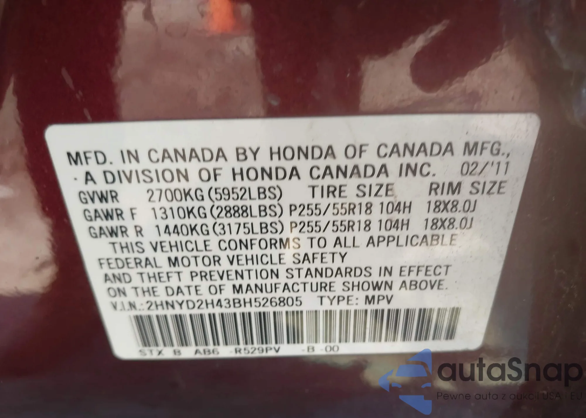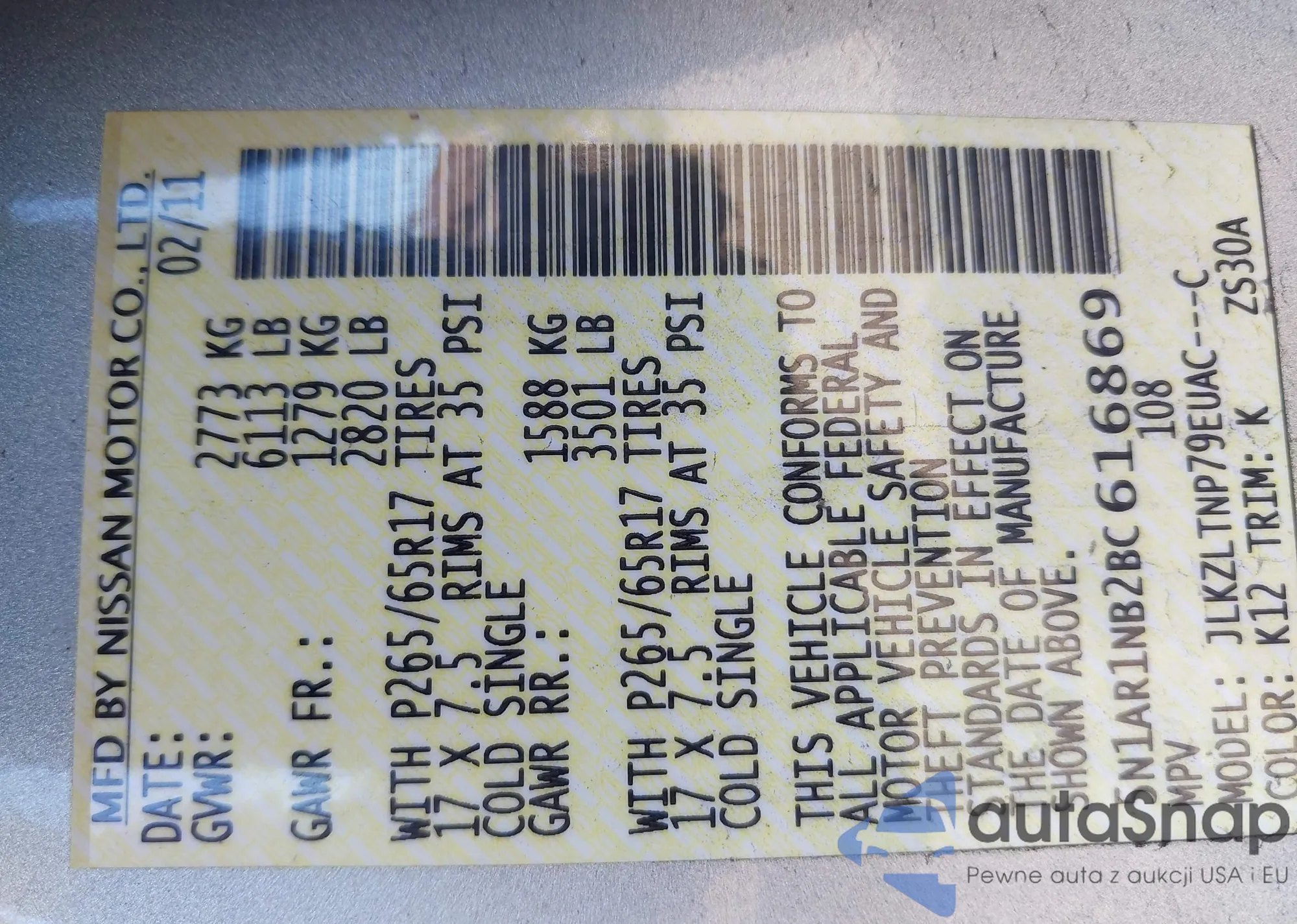 • VIN 5N1AR1NB2BC616869