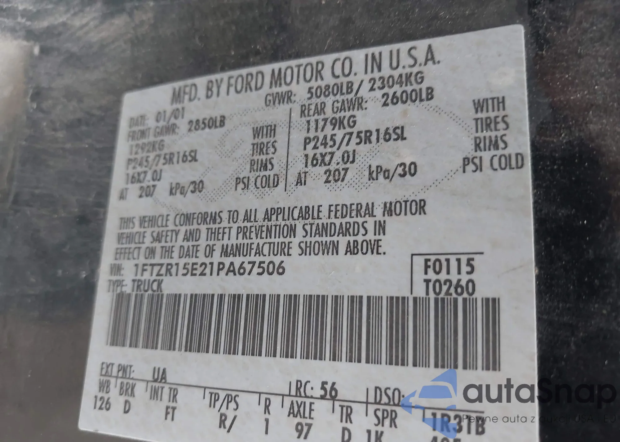 LOT: 43285517 VIN: 1FTZR15E21PA67506
