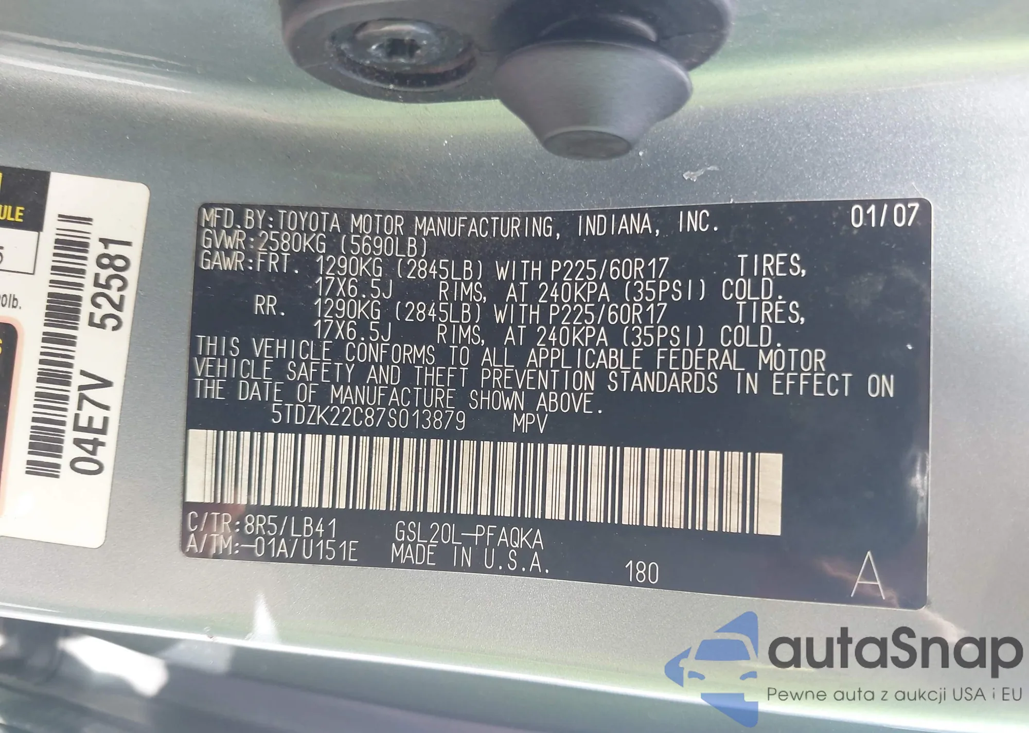 2007 Toyota Sienna Xle z USA, uszkodzony, nr VIN 5TDZK22C87S013879