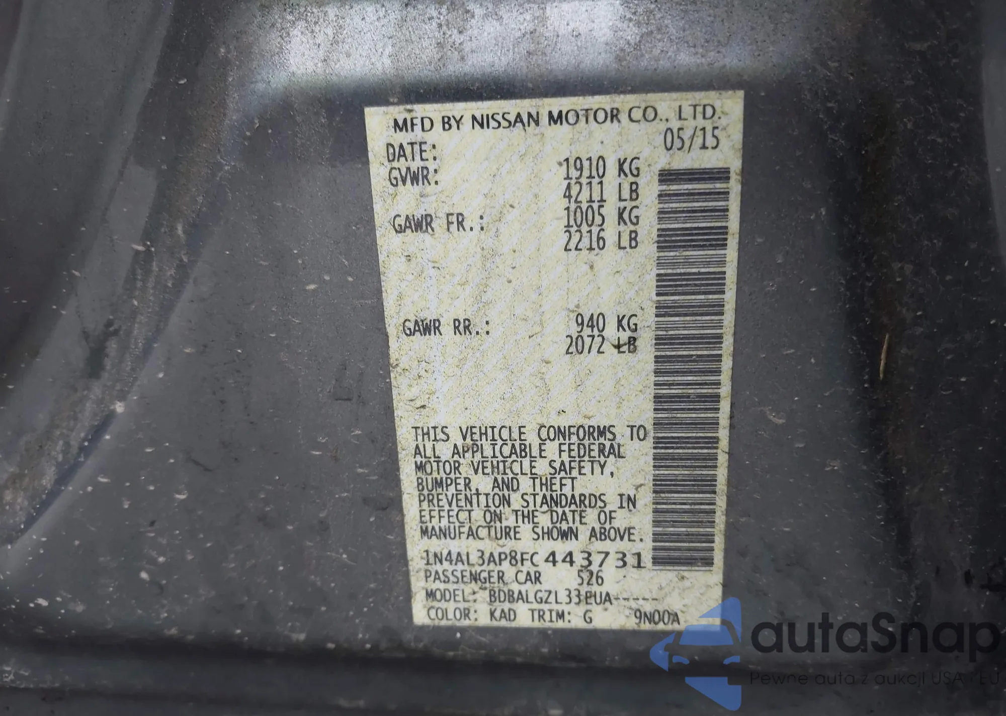 2015 Nissan Altima 2.5/2.5 S/2.5 Sl/2.5 Sv z USA, uszkodzony, nr VIN 1N4AL3AP8FC443731