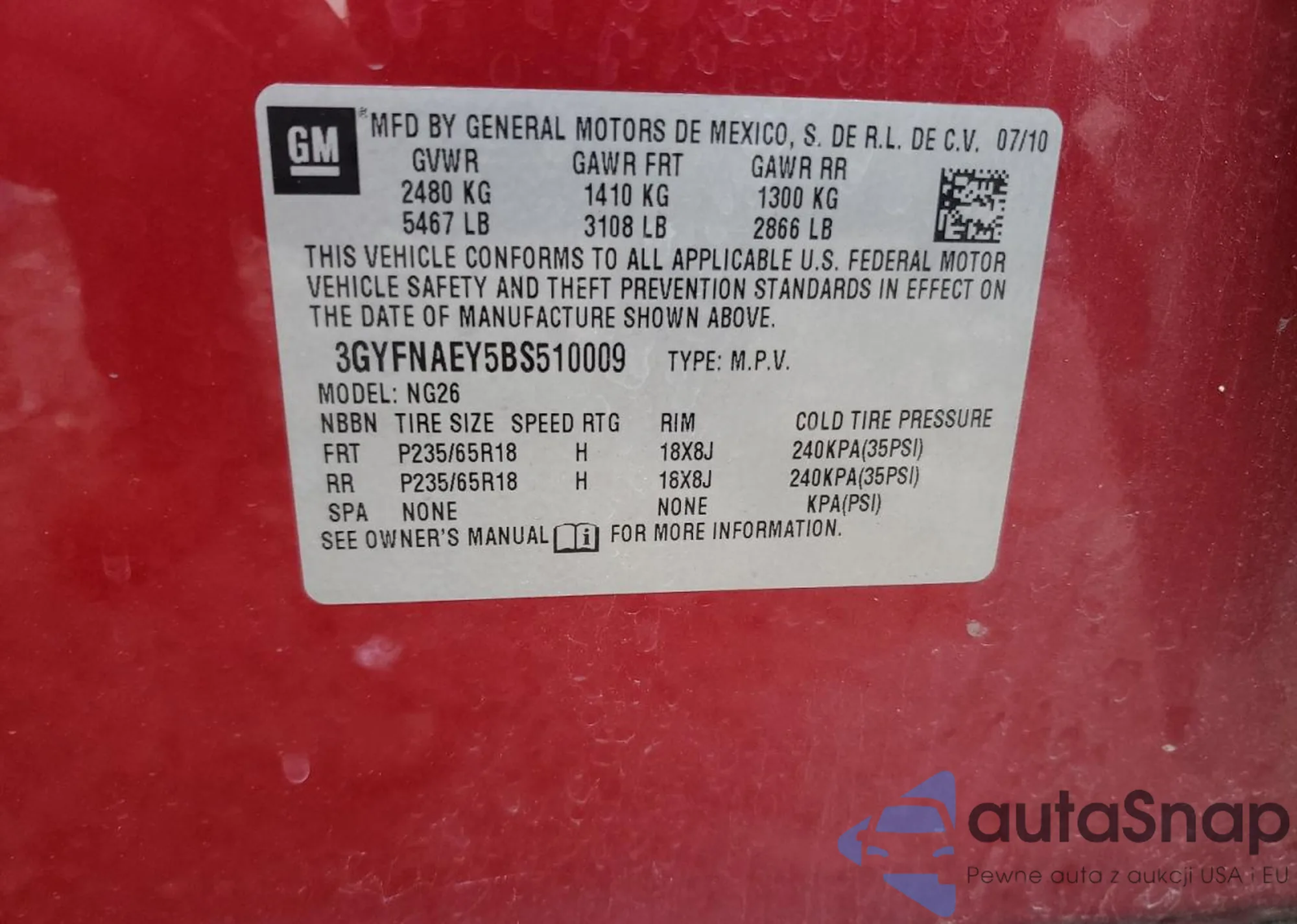 • VIN 3GYFNAEY5BS510009