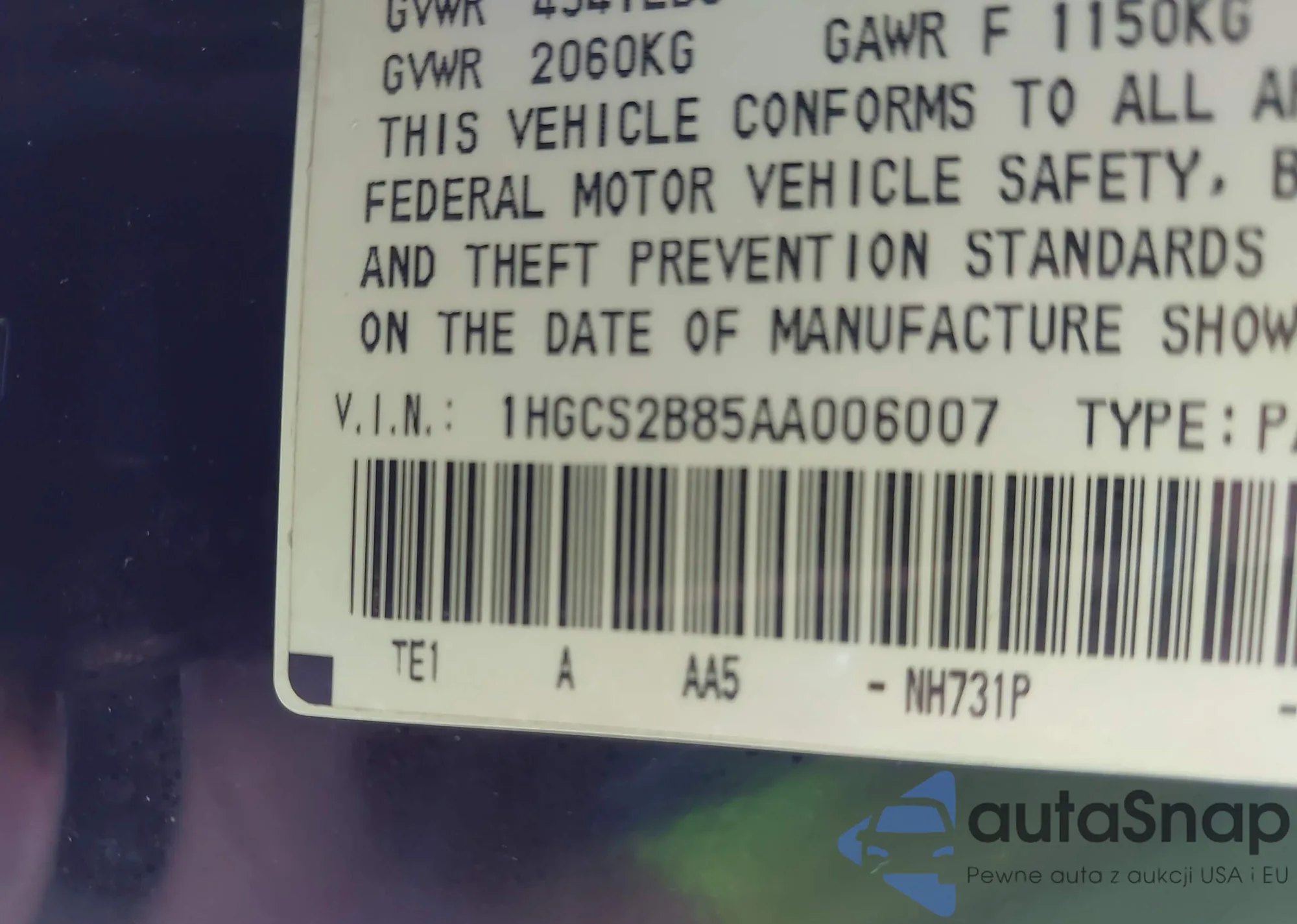 LOT: 43235642 VIN: 1HGCS2B85AA006007