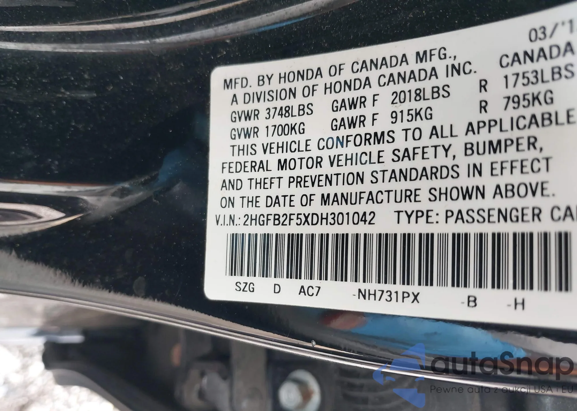 • VIN 2HGFB2F5XDH301042