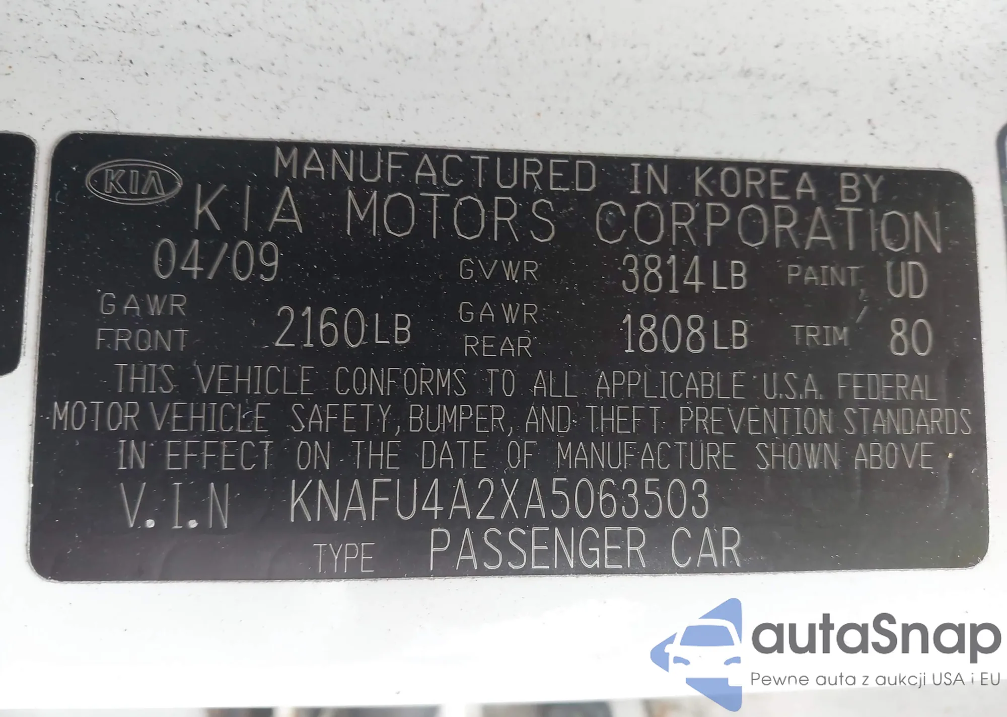 LOT: 43308804 VIN: KNAFU4A2XA5063503