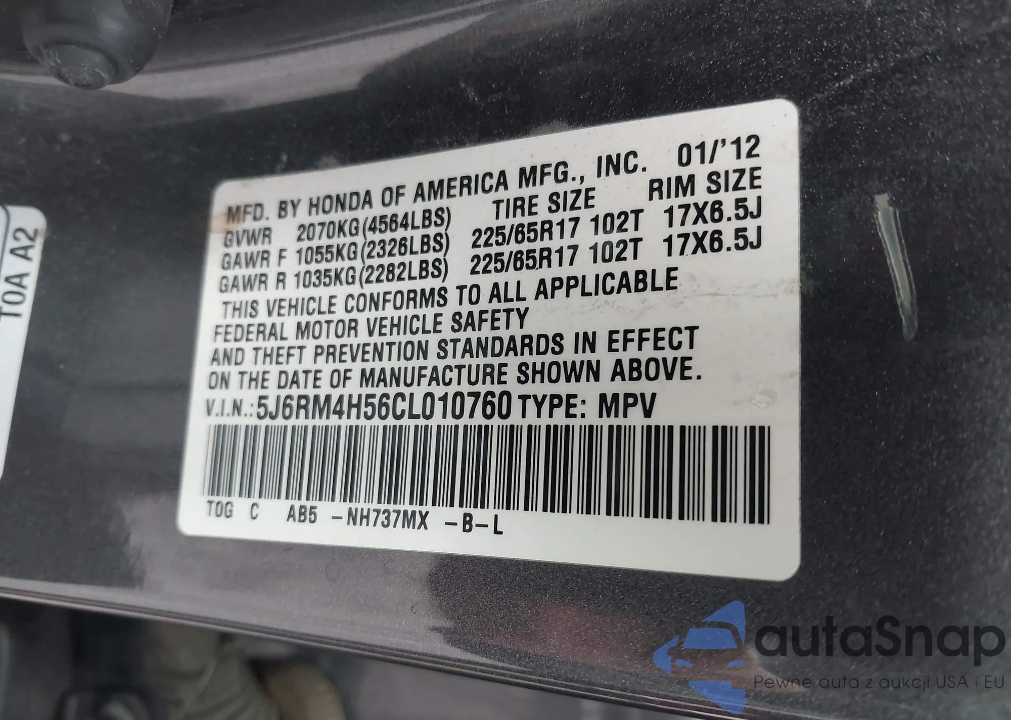 • VIN 5J6RM4H56CL010760