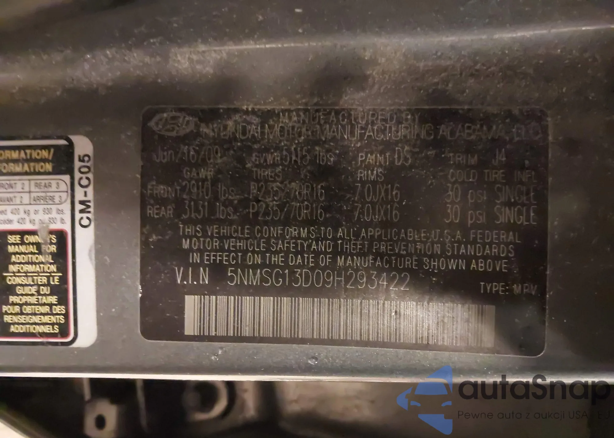 LOT: 43447461 VIN: 5NMSG13D09H293422