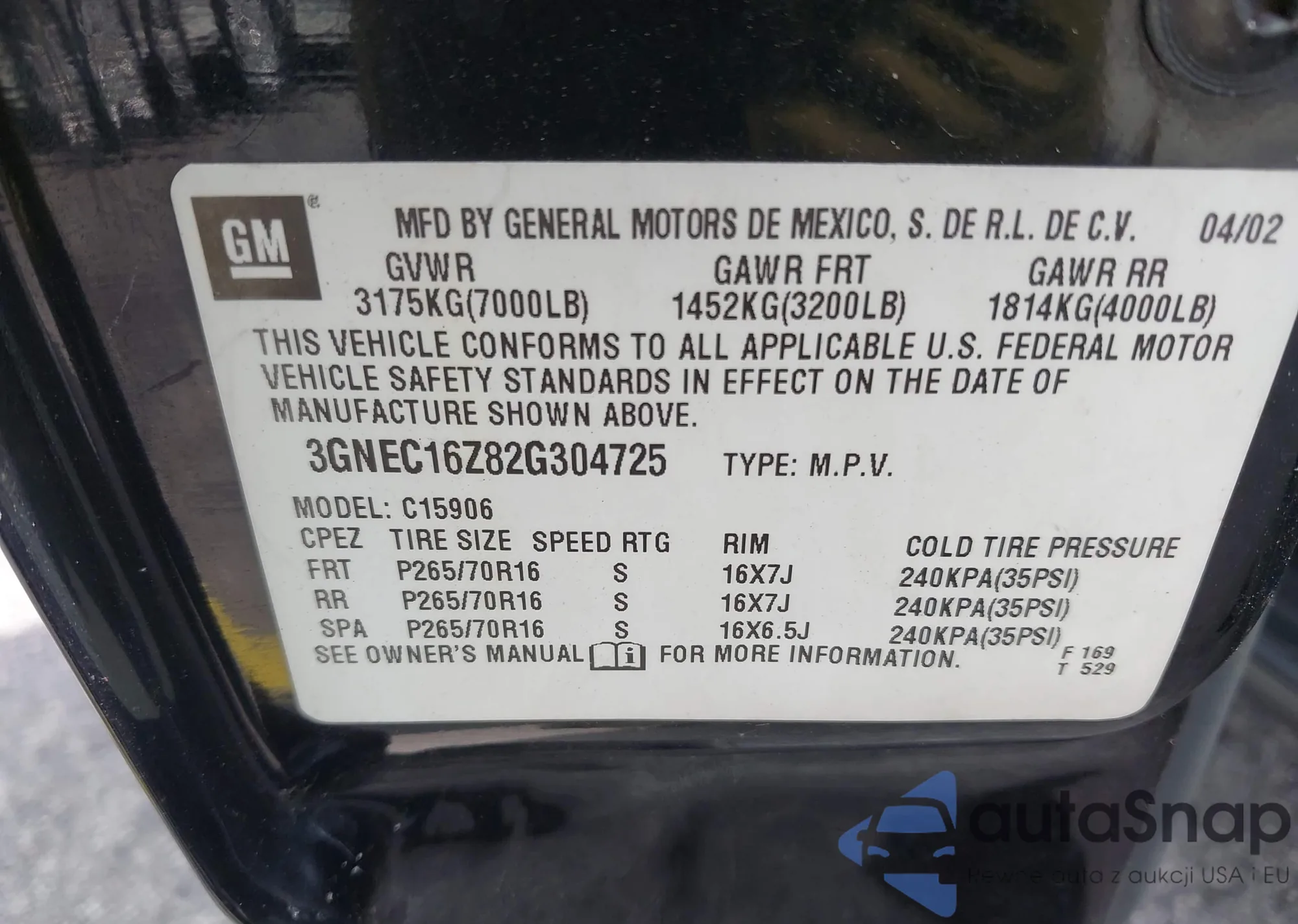 • VIN 3GNEC16Z82G304725
