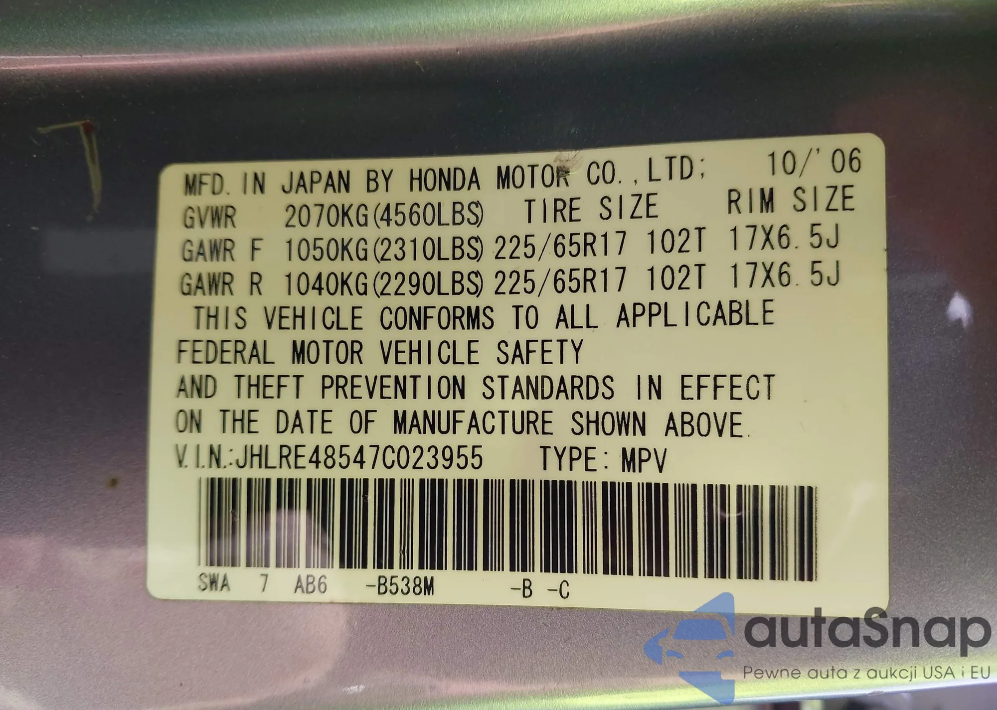 LOT: 43187773 VIN: 2HGFG12847H550971