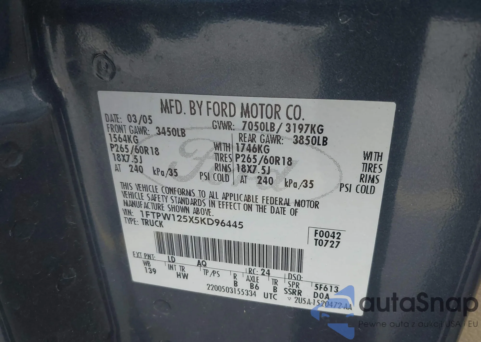 • VIN 1FTPW125X5KD96445