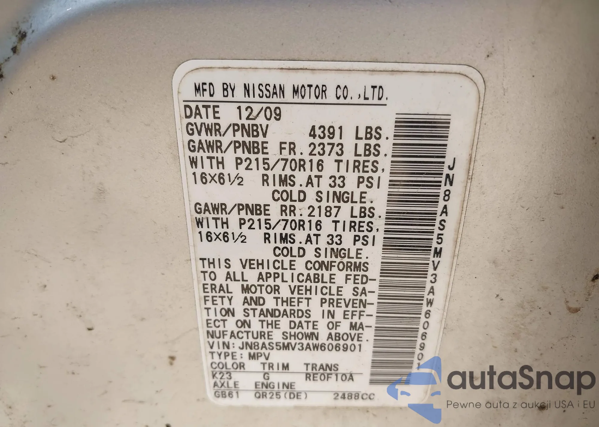 • VIN JN8AS5MV3AW606901