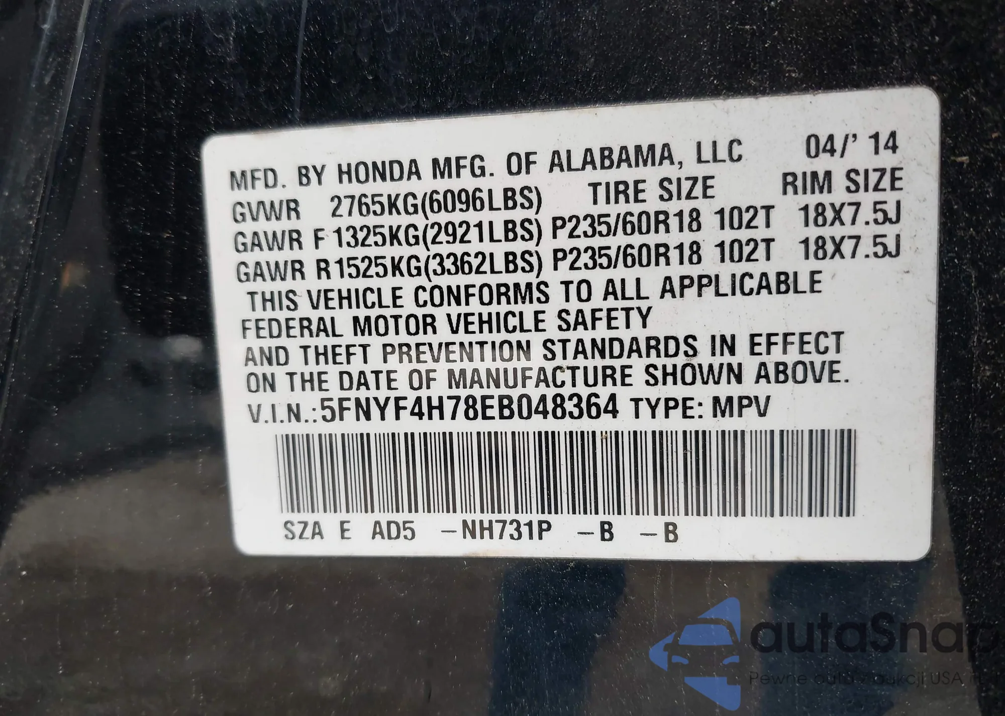 LOT: 43249049 VIN: 5FNYF4H78EB048364
