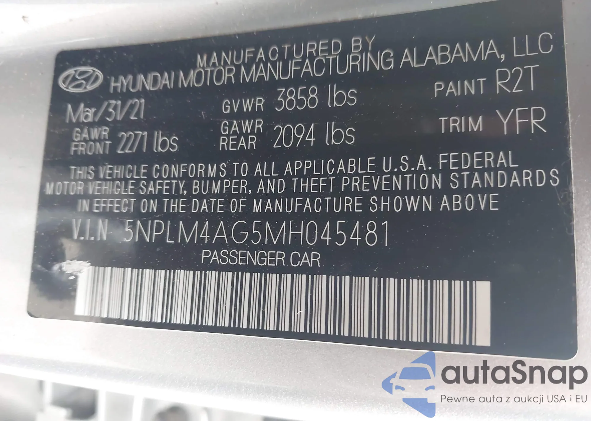 LOT: 43254671 VIN: 5NPLM4AG5MH045481