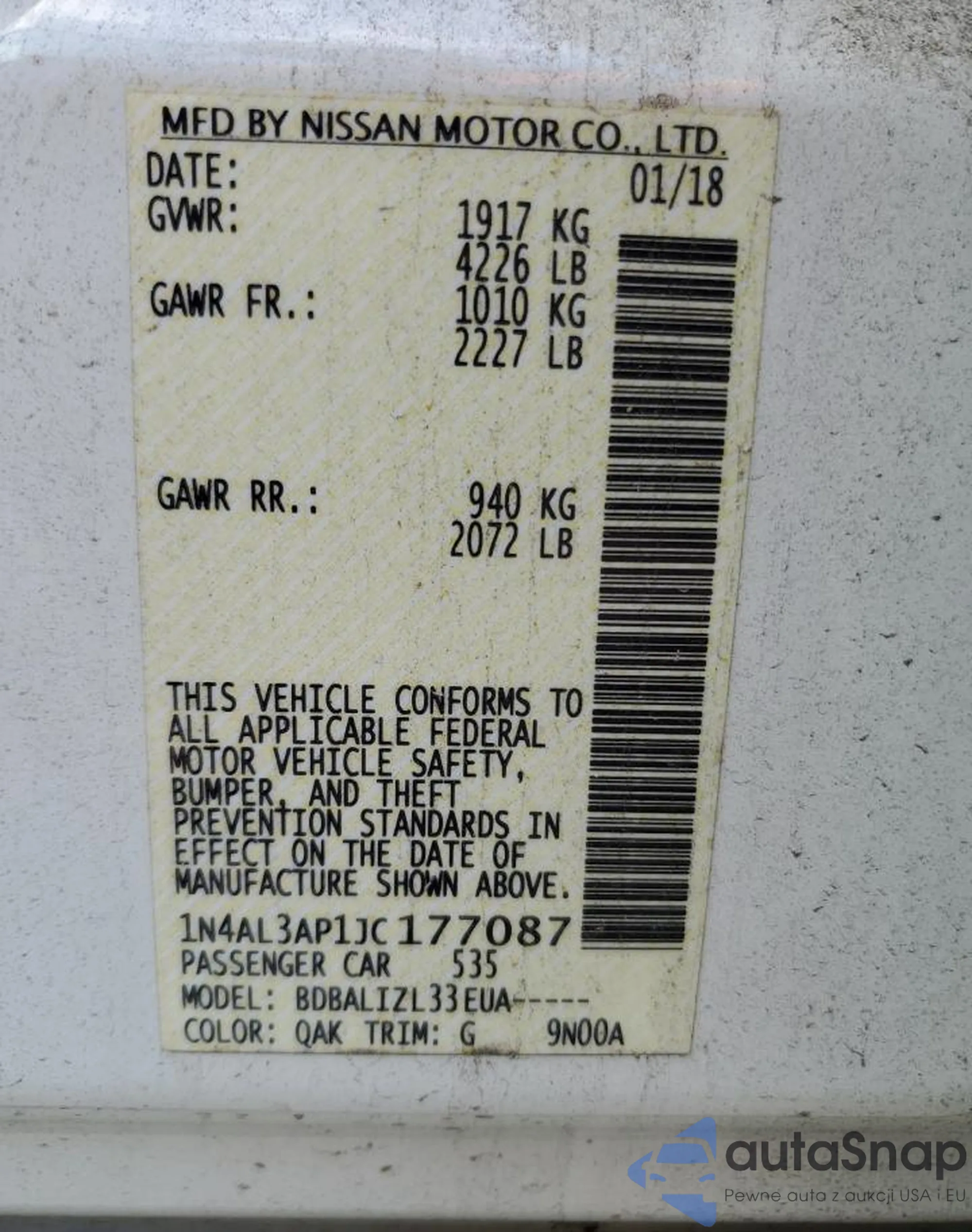 LOT: 69940165 VIN: 1N4AL3AP1JC177087