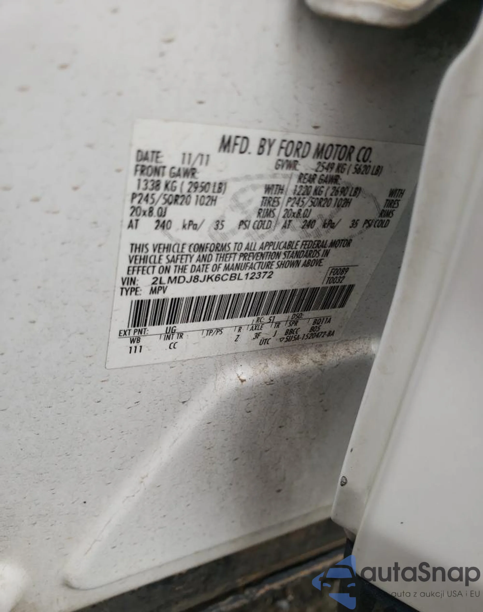 LOT: 85104075 VIN: 2LMDJ8JK6CBL12372