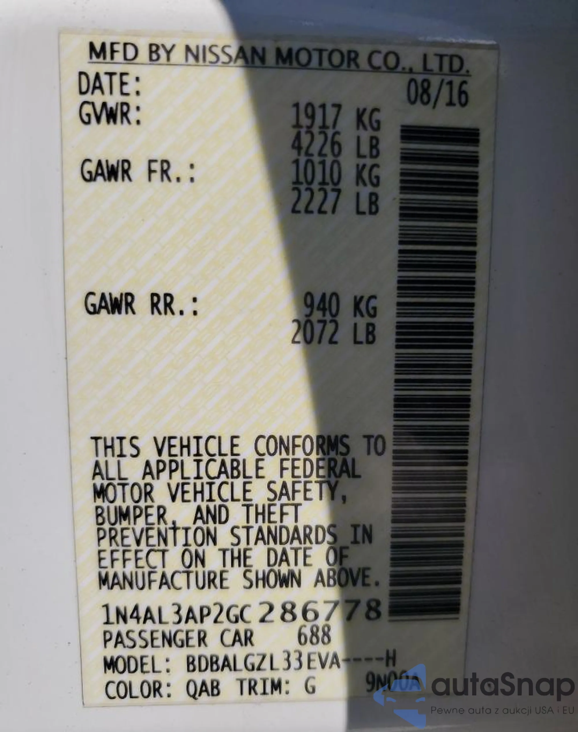 LOT: 85598735 VIN: 1N4AL3AP2GC286778