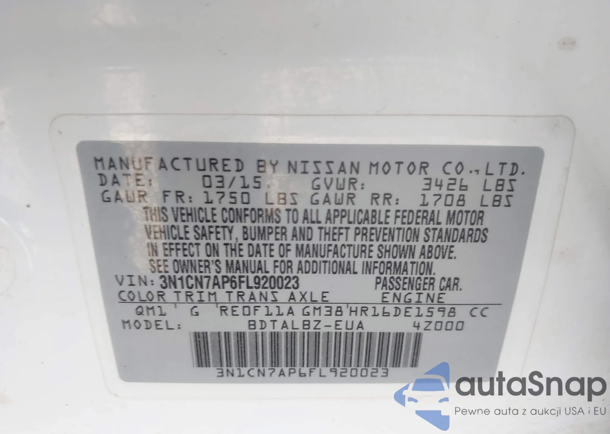 • VIN 3N1AB6AP3BL665612
