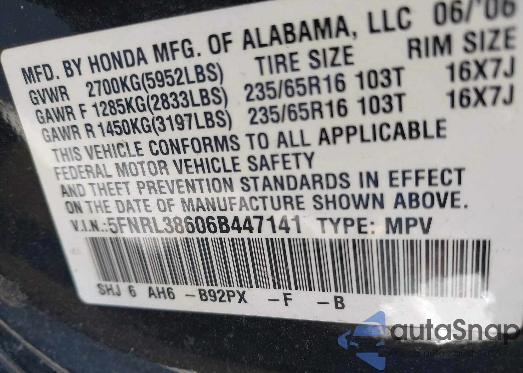 • VIN 5FNRL38606B447141