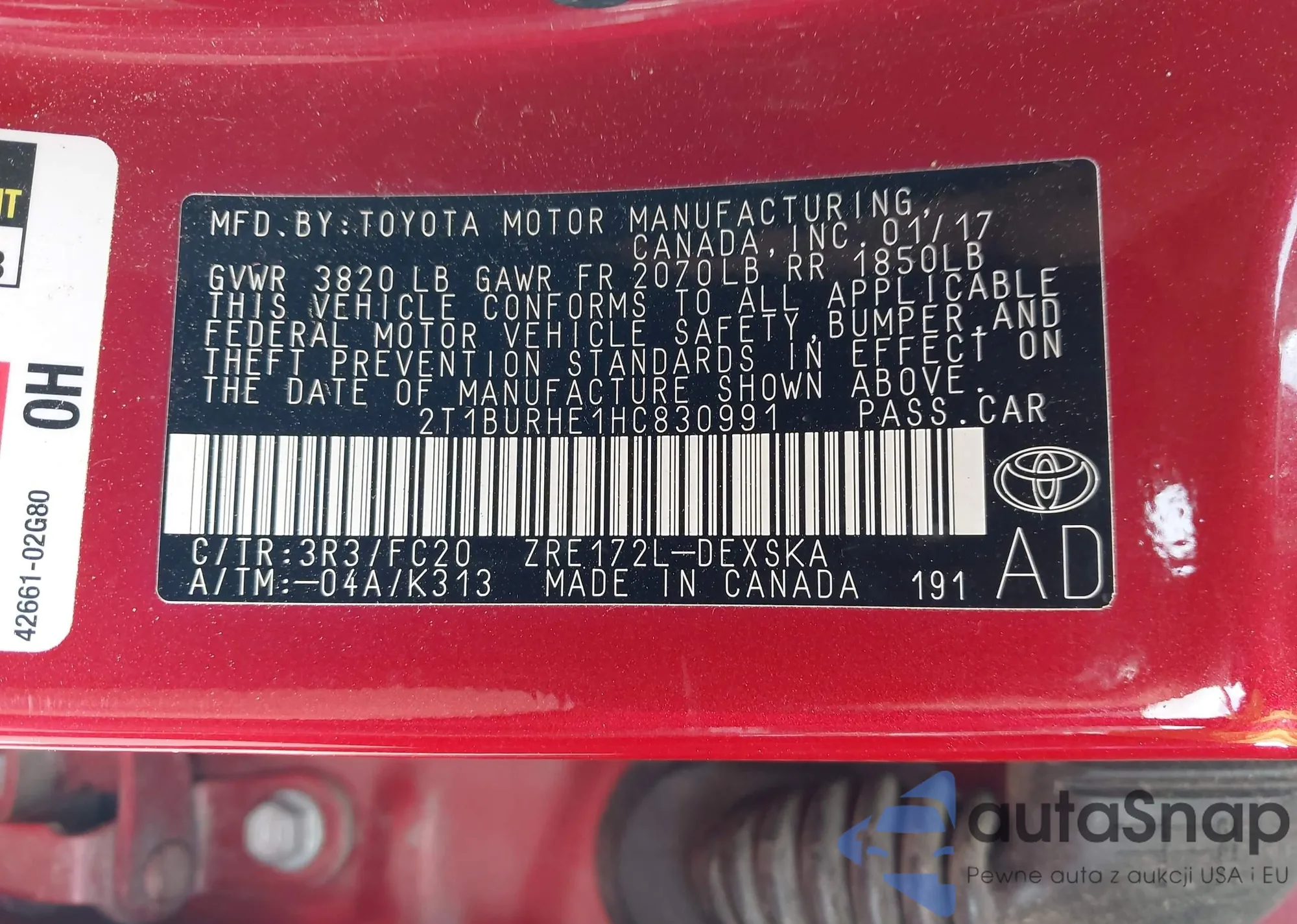 LOT: 43250349 VIN: 2T1BURHE1HC830991