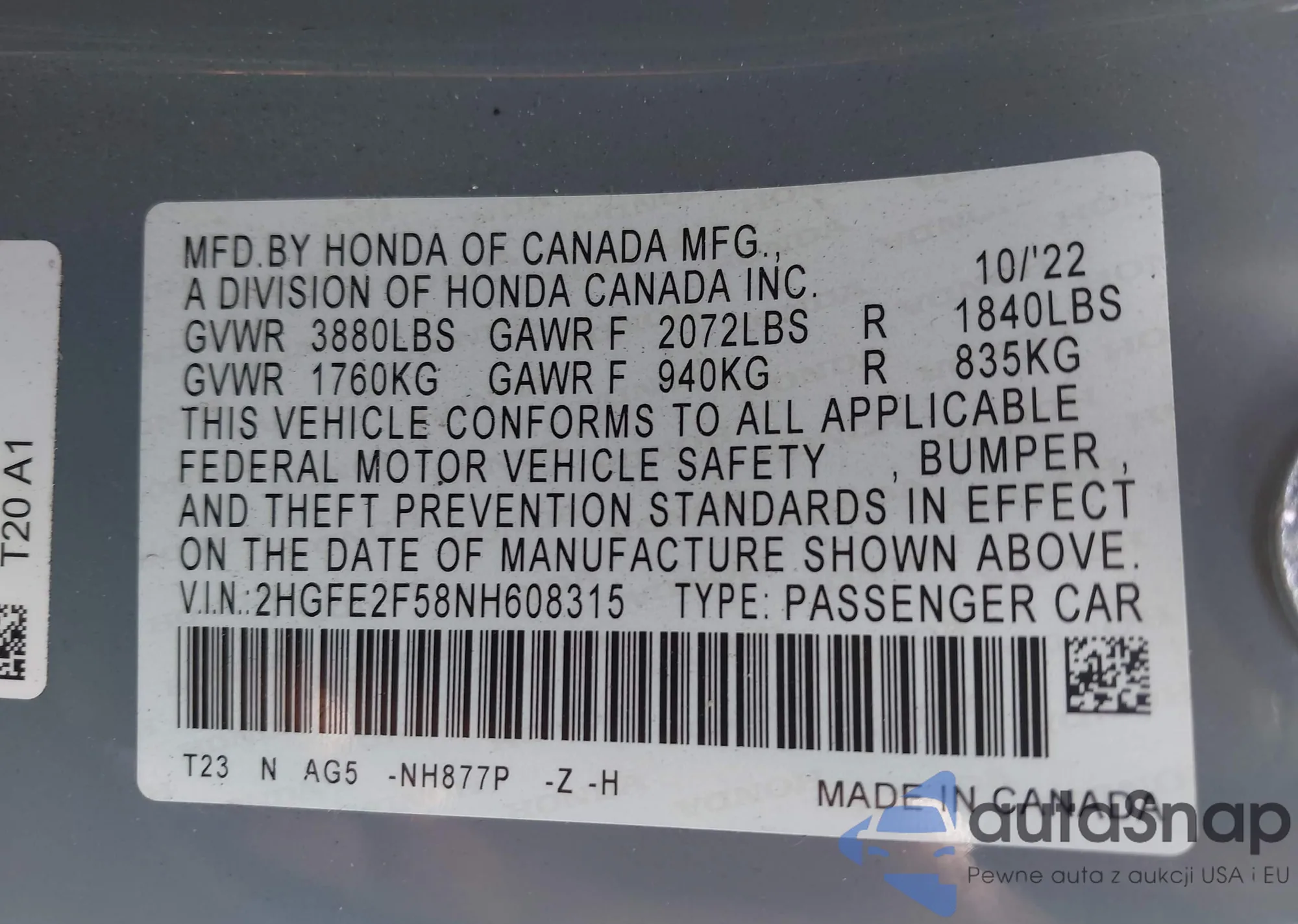 • VIN 2HGFE2F58NH608315