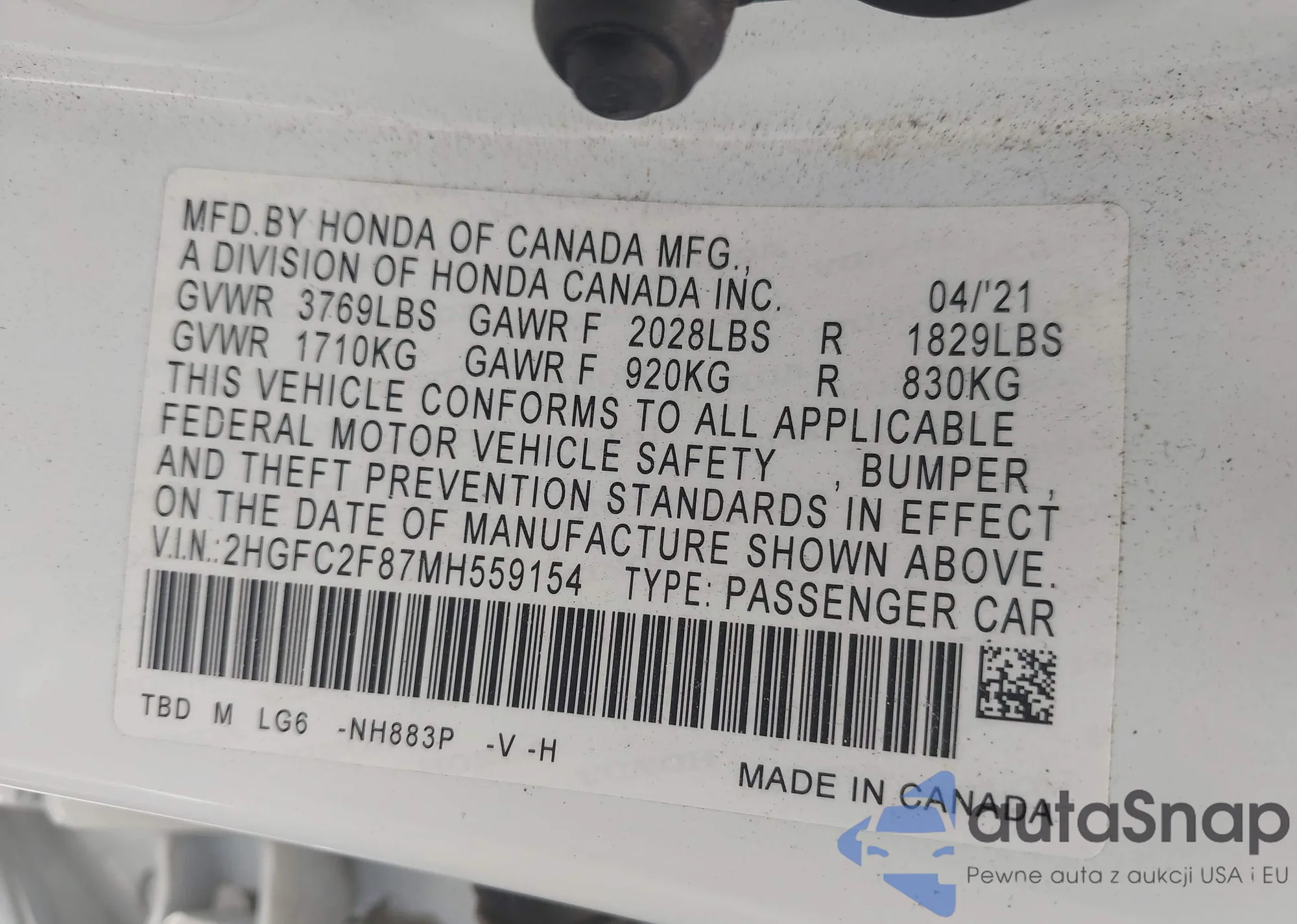 LOT: 43335867 VIN: 2HGFC2F87MH559154