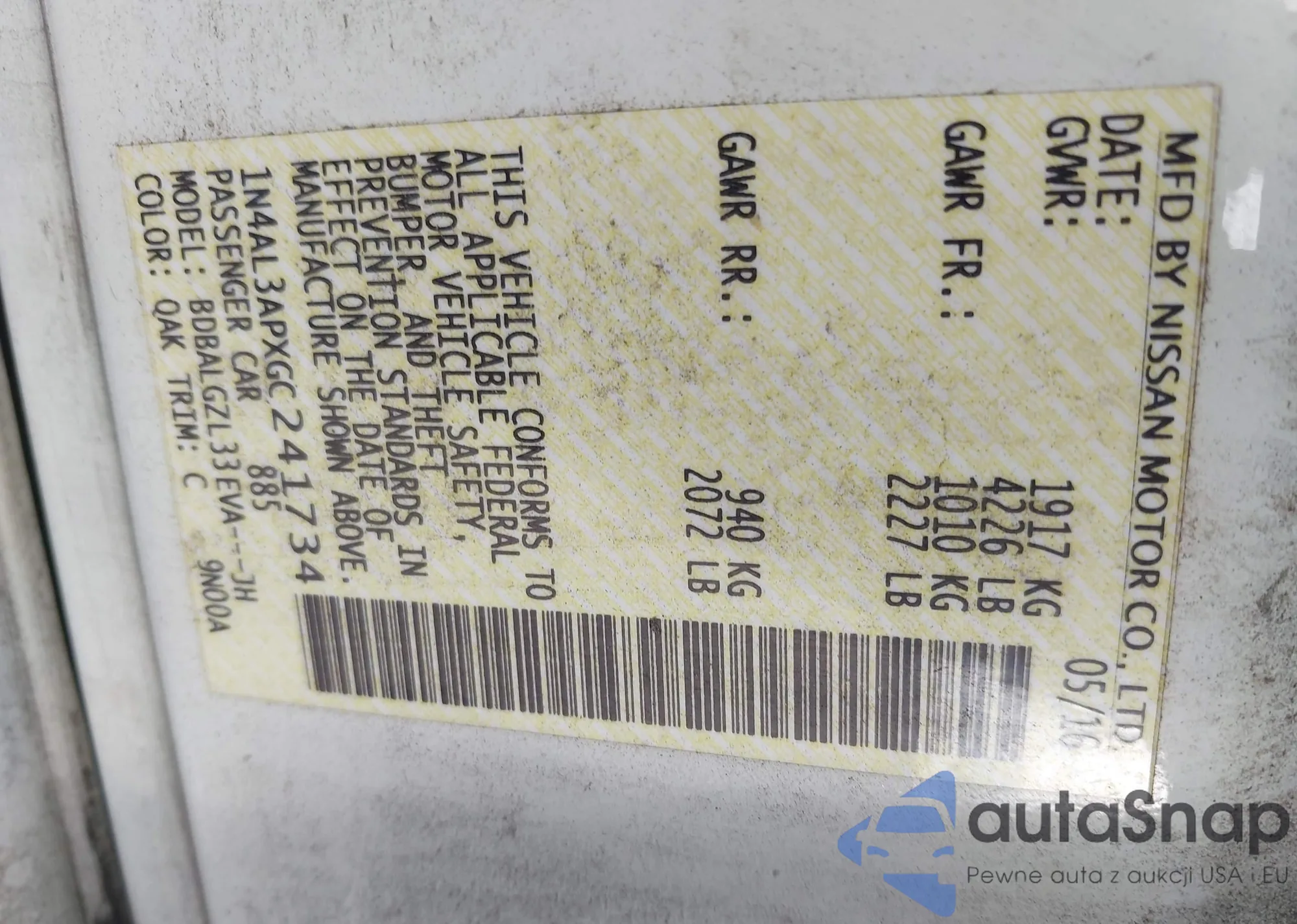 LOT: 43405067 VIN: 1N4AL3APXGC241734