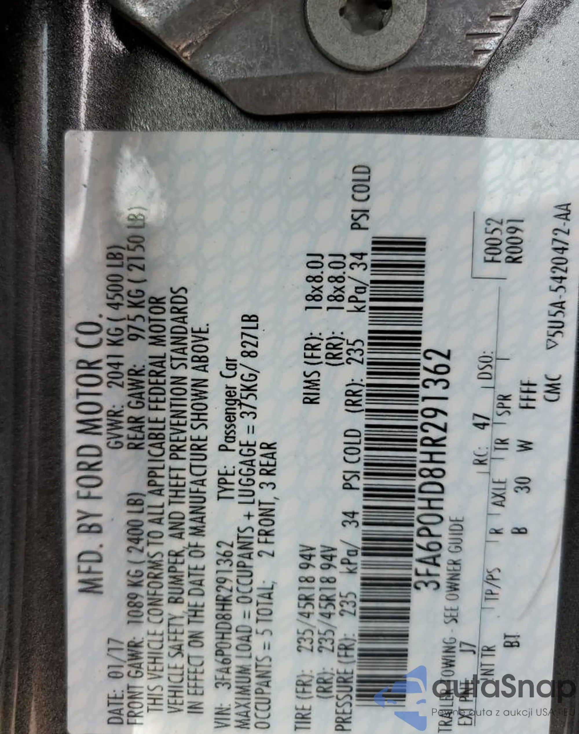 LOT: 81489355 VIN: 3FA6P0HD8HR291362