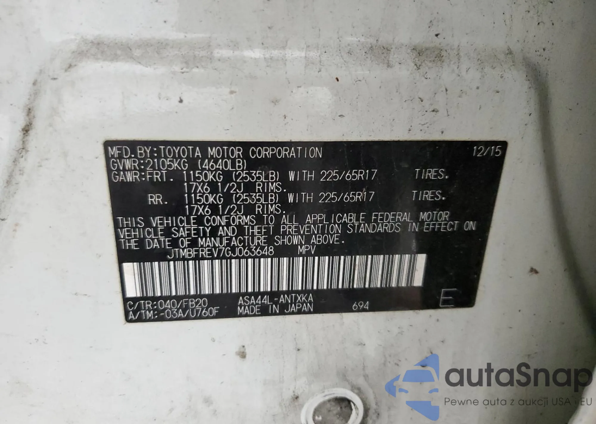 LOT: 84552775 VIN: JTMBFREV7GJ063648