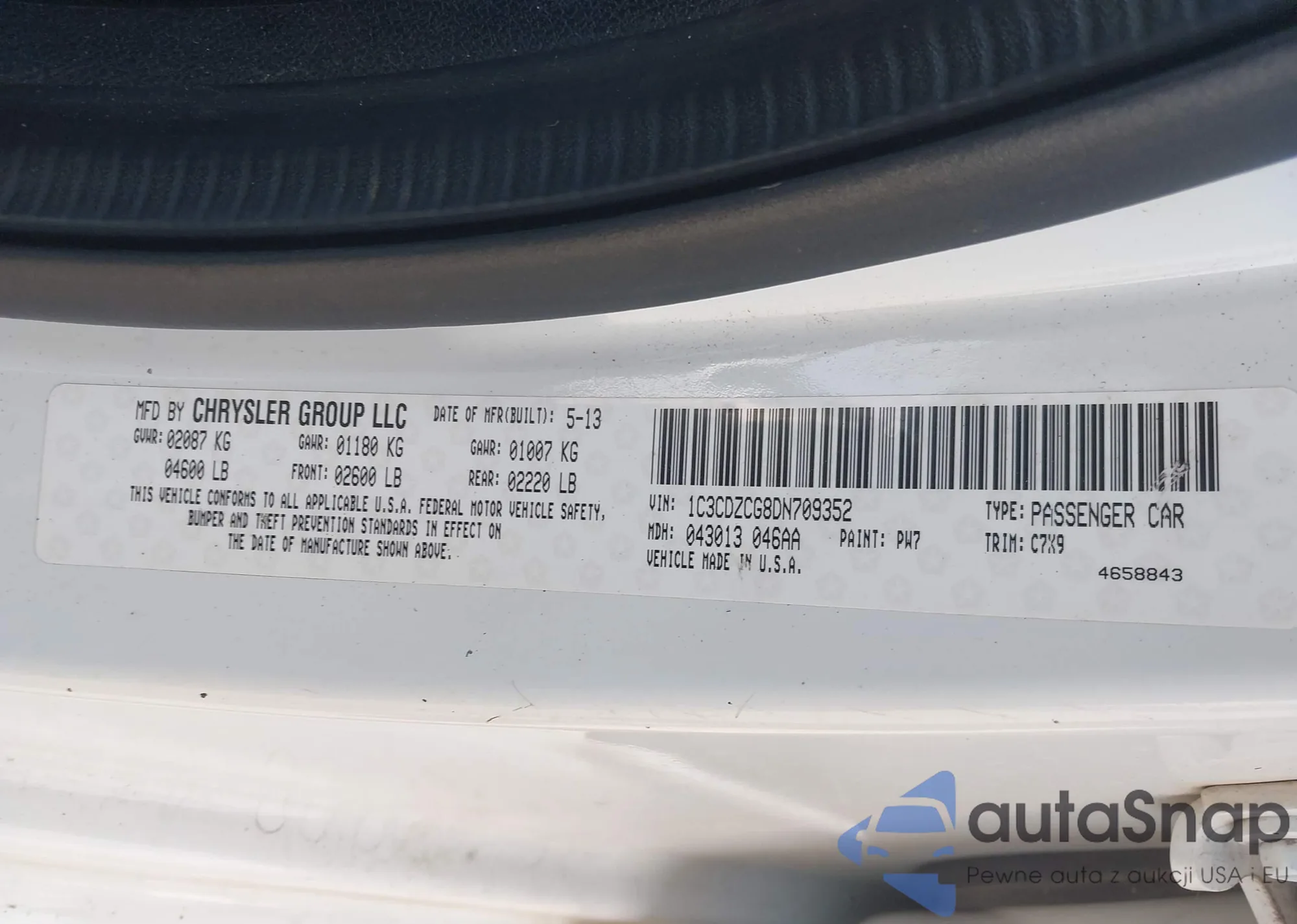 LOT: 43338881 VIN: 1C3CDZCG8DN709352