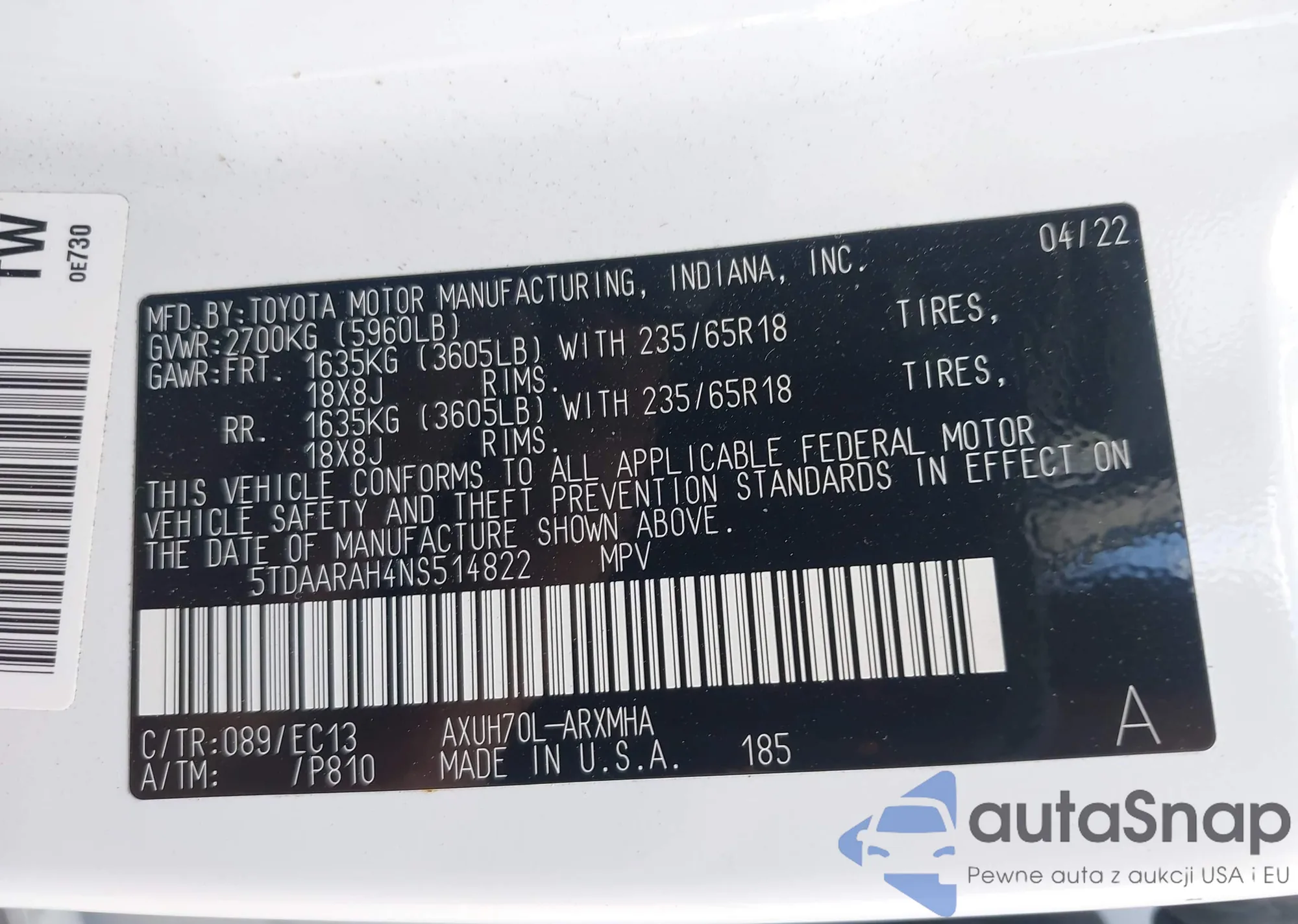 • VIN 5TDAARAH4NS514822