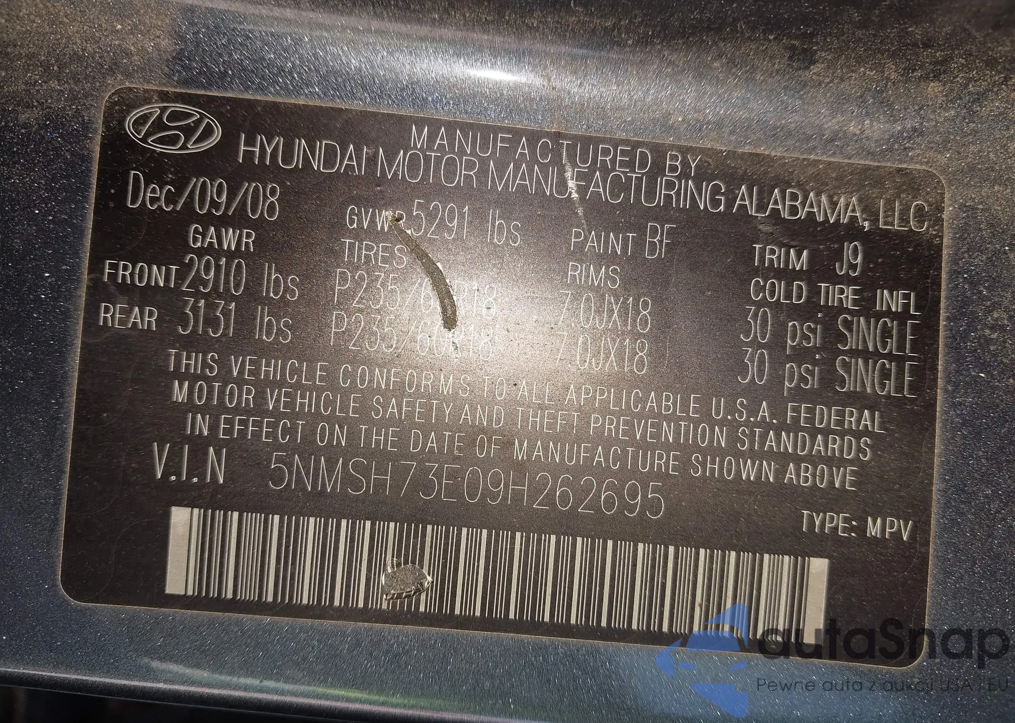 LOT: 43380256 VIN: 5NMSH73E09H262695