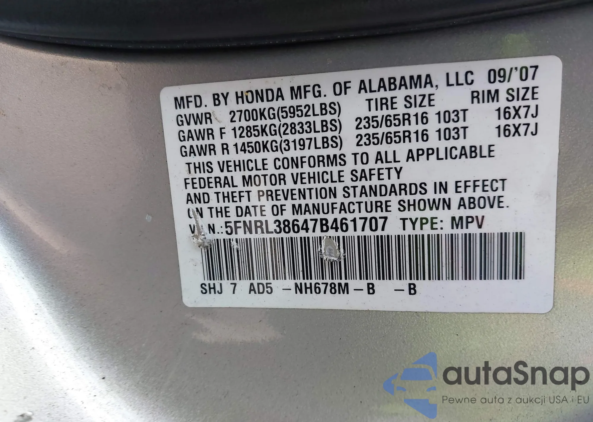 • VIN 5FNRL38647B461707