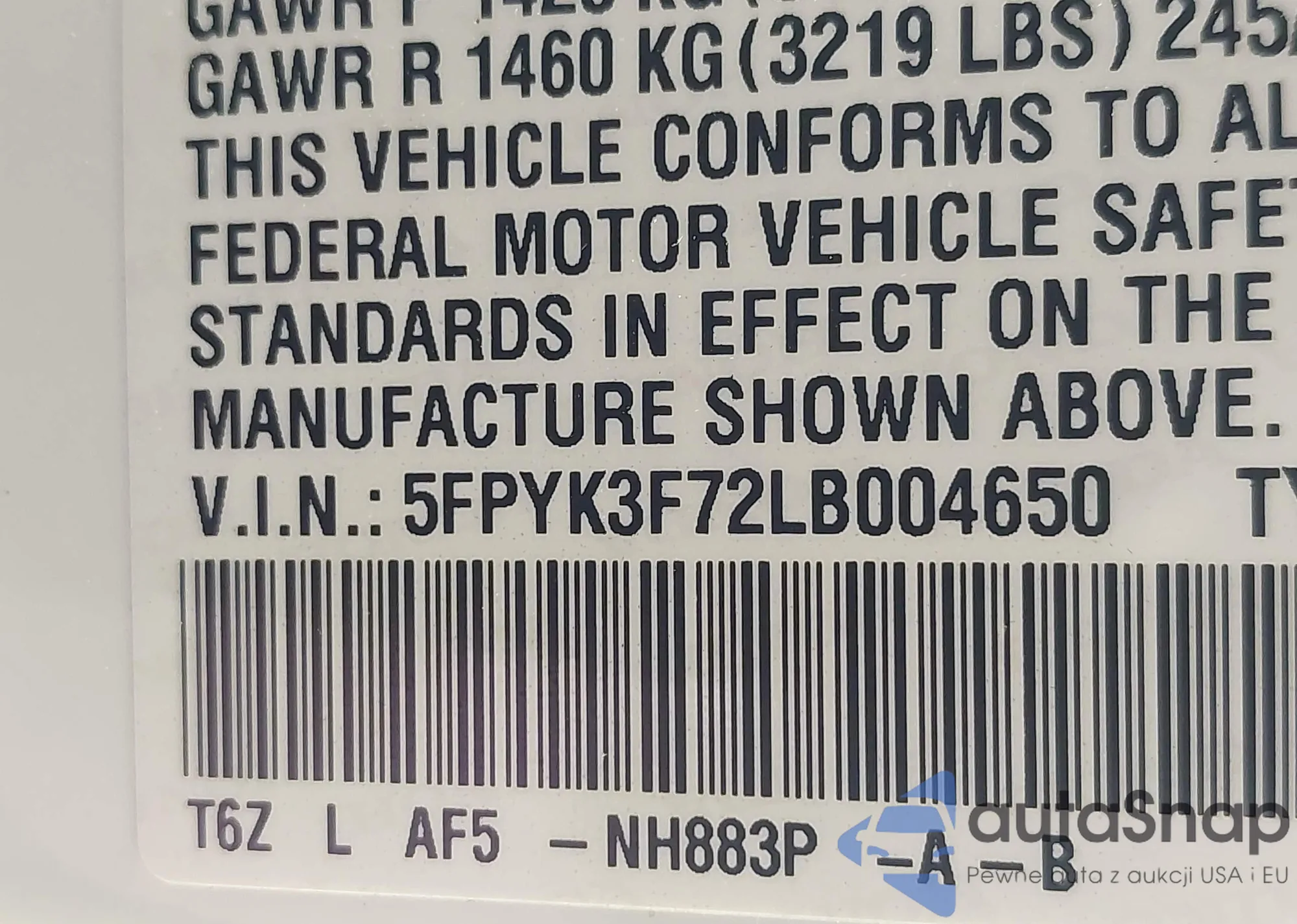 • VIN 5FPYK3F72LB004650