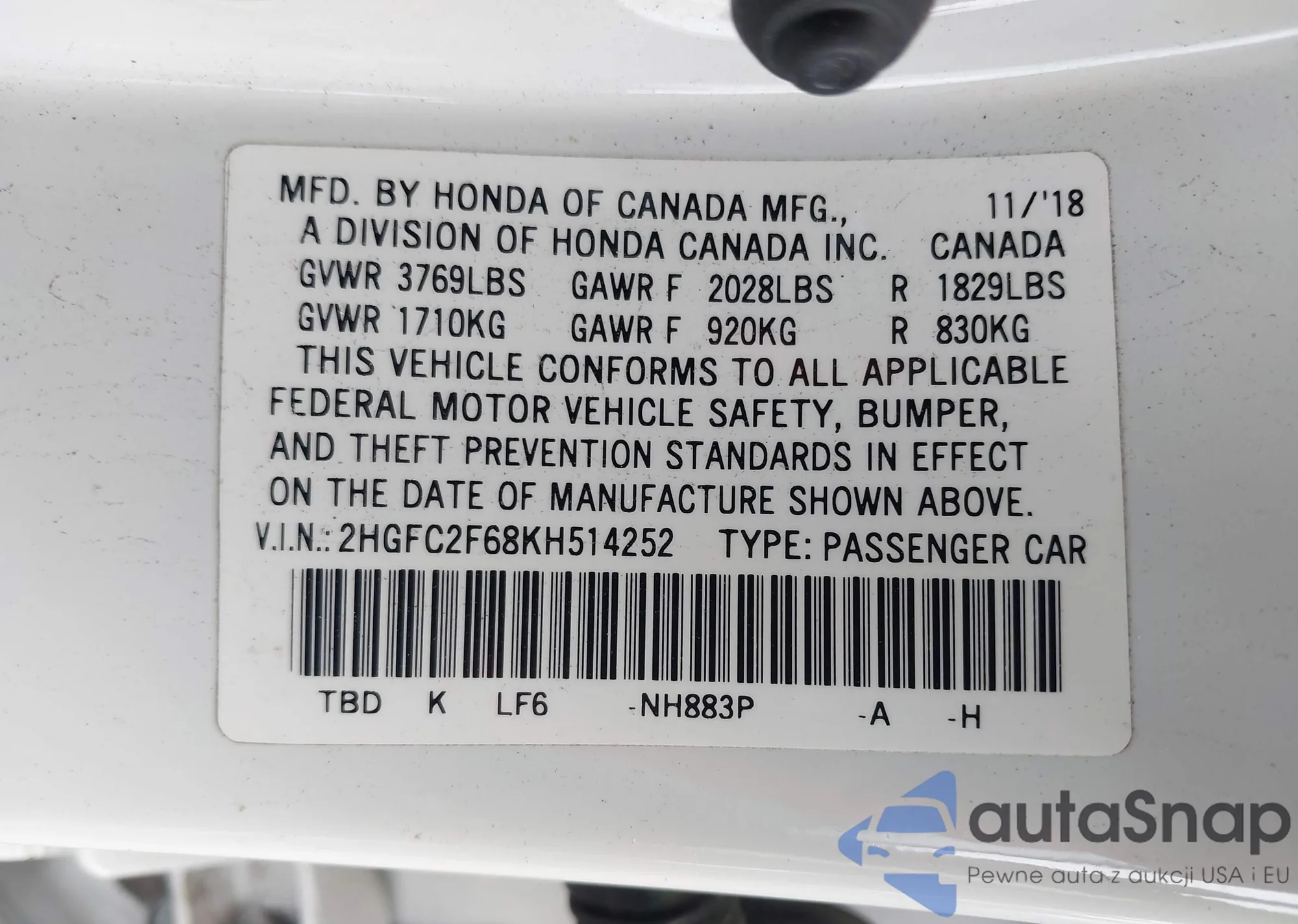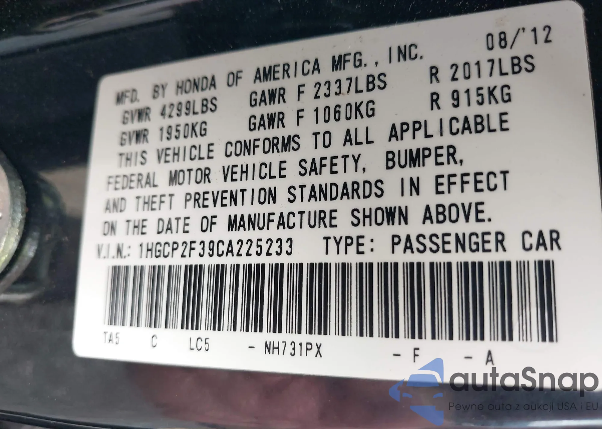 LOT: 43223887 VIN: 2HGFC1F75GH633127