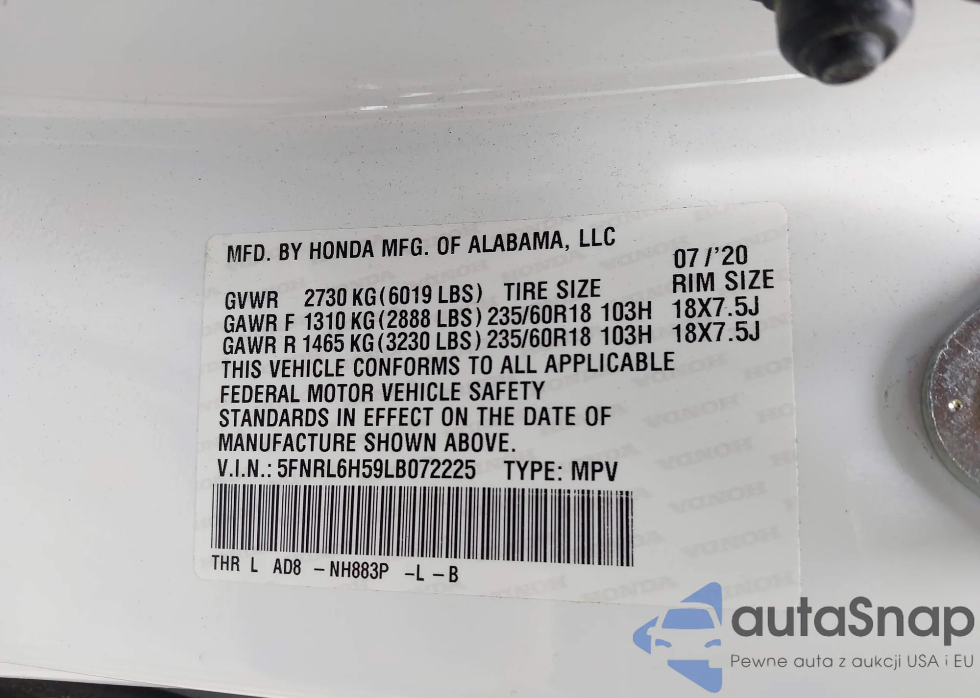 • VIN 5FNRL6H59LB072225