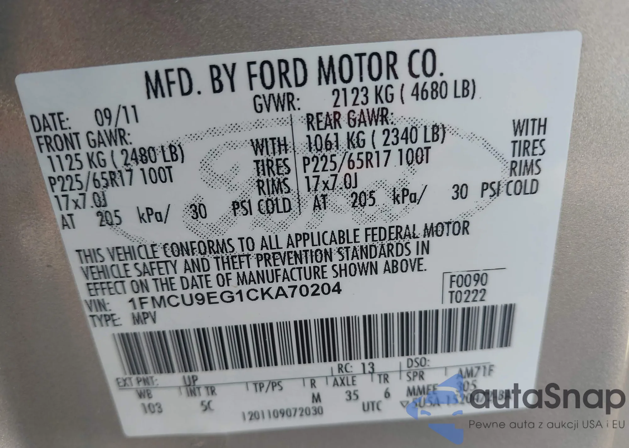 • VIN 1FMCU9EG1CKA70204