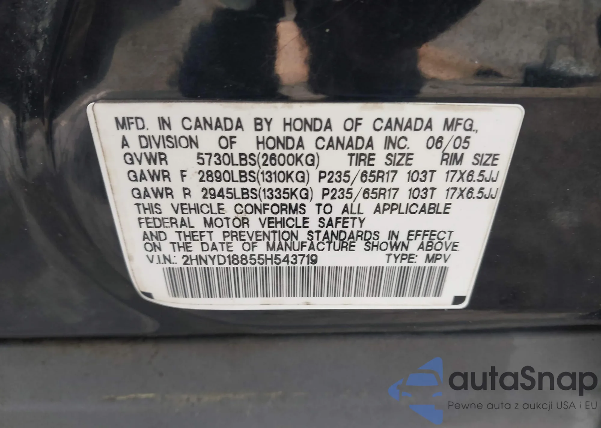 LOT: 43037666 VIN: 2HNYD18855H543719
