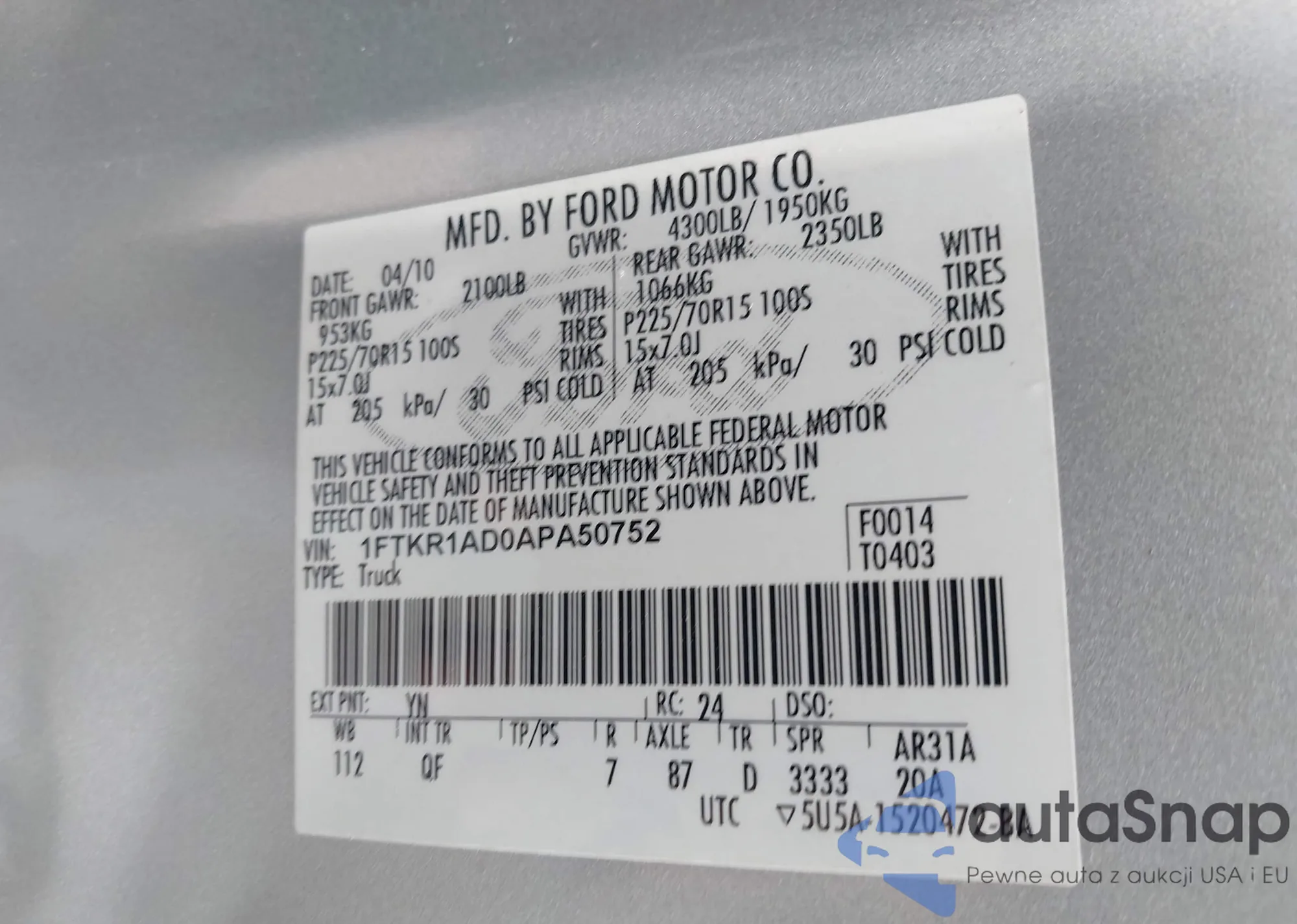 LOT: 43050948 VIN: 1FTKR1AD0APA50752