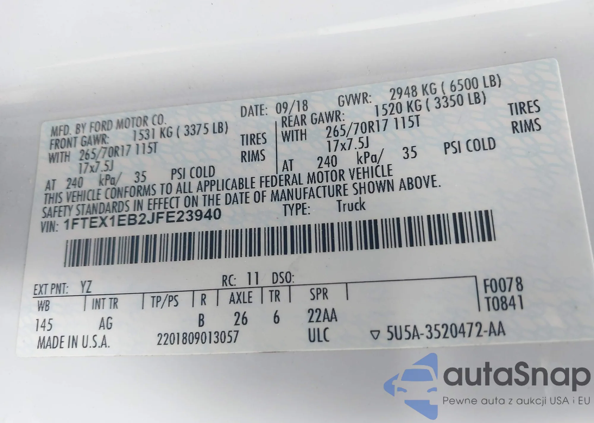 LOT: 43326879 VIN: 1FTPW14594KC73148