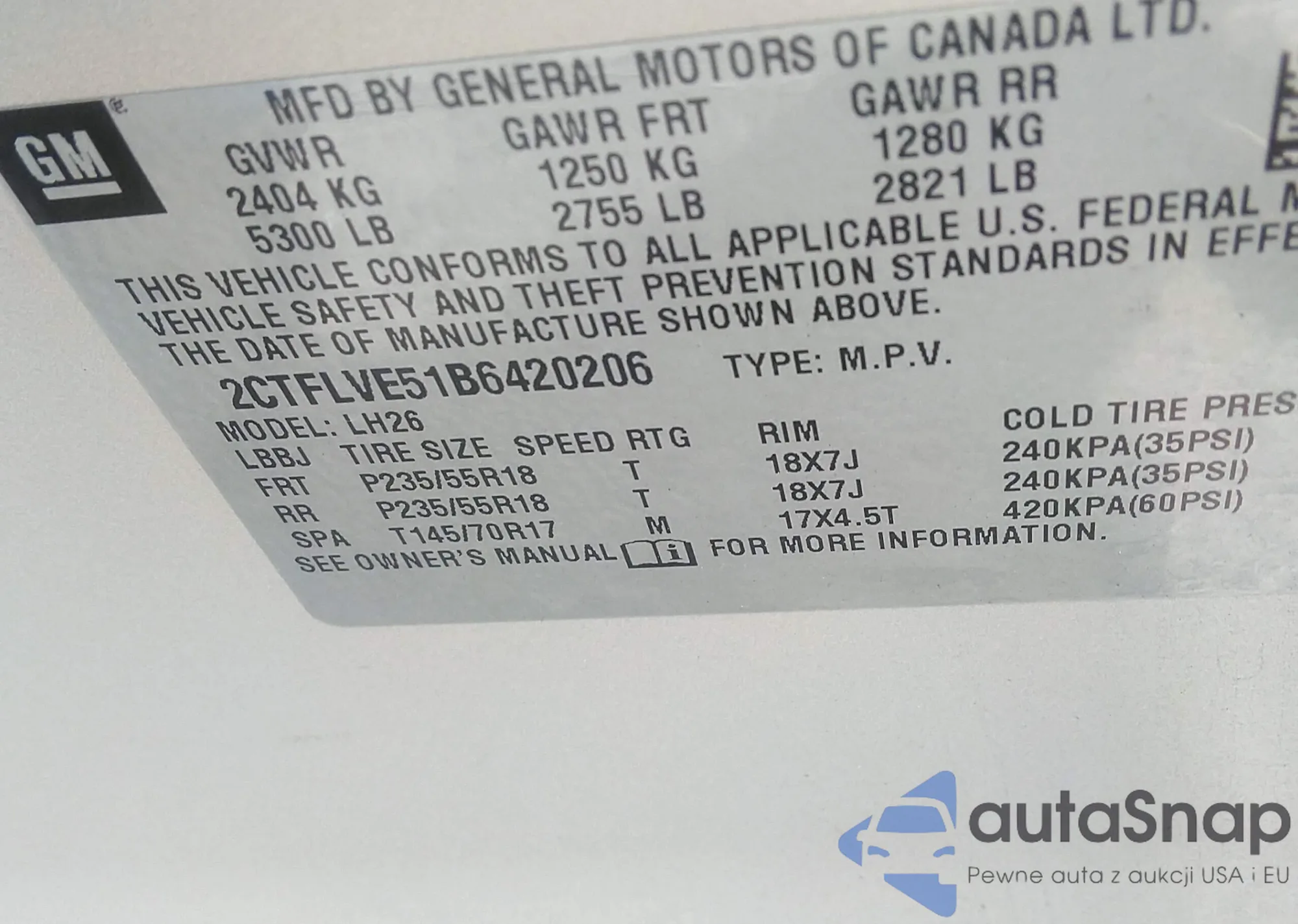 LOT: 43307542 VIN: 2CTFLVE51B6420206