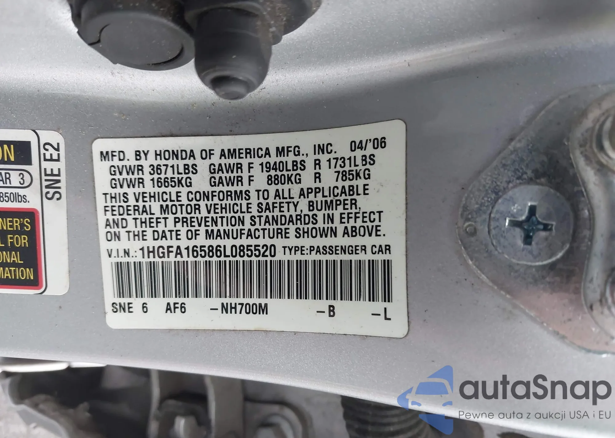 LOT: 43283458 VIN: 1HGCM66577A015446